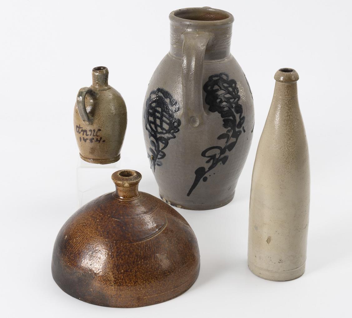 Defekter Tüllenkrug mit großen Blumen, H 32,5 cm. Bitterwasserflasche, H 31 cm. Schnapskrüglein, datiert "Anno 1754", H 15 cm. Seltenes Halbkugelgefäß mit kurzem Enghals, H 15 cm. Partiell Altersspuren und Defekte.