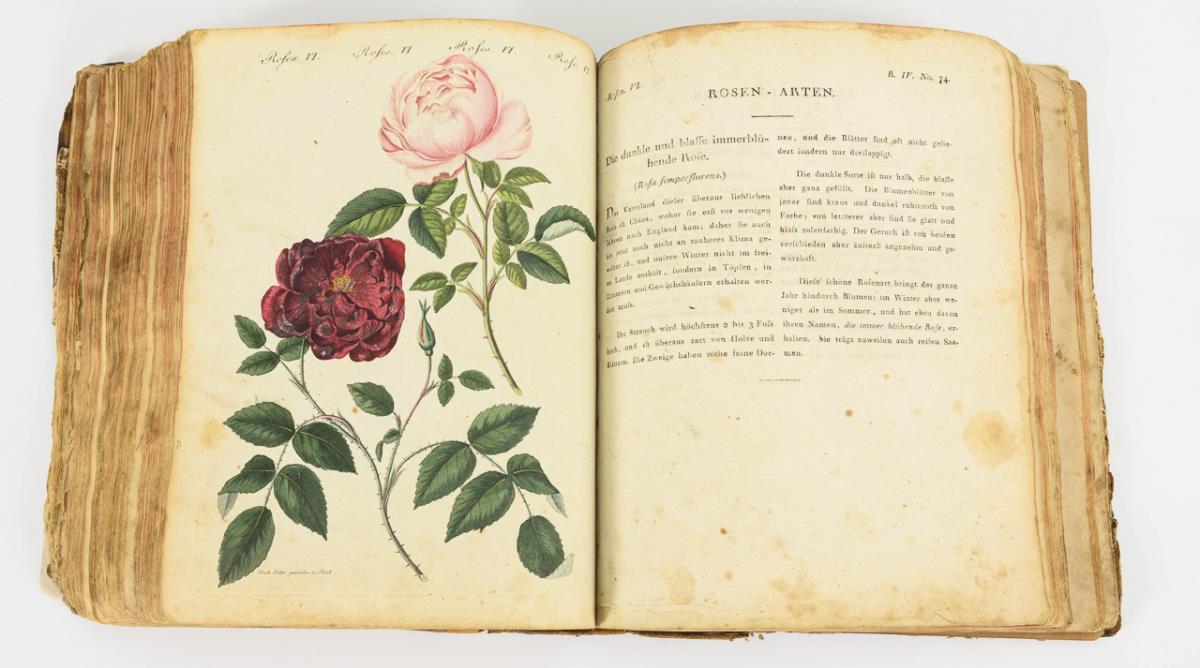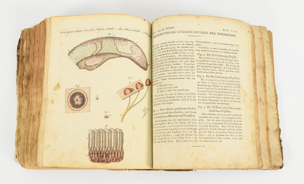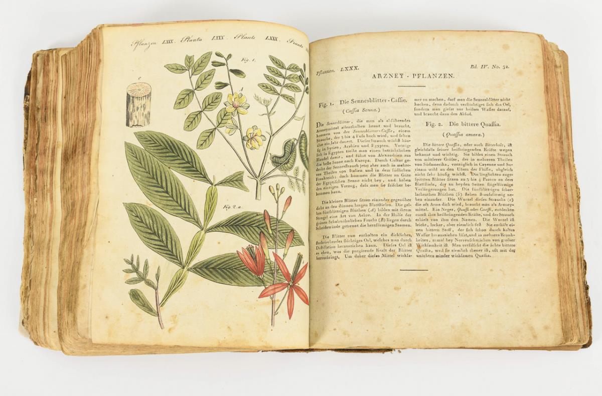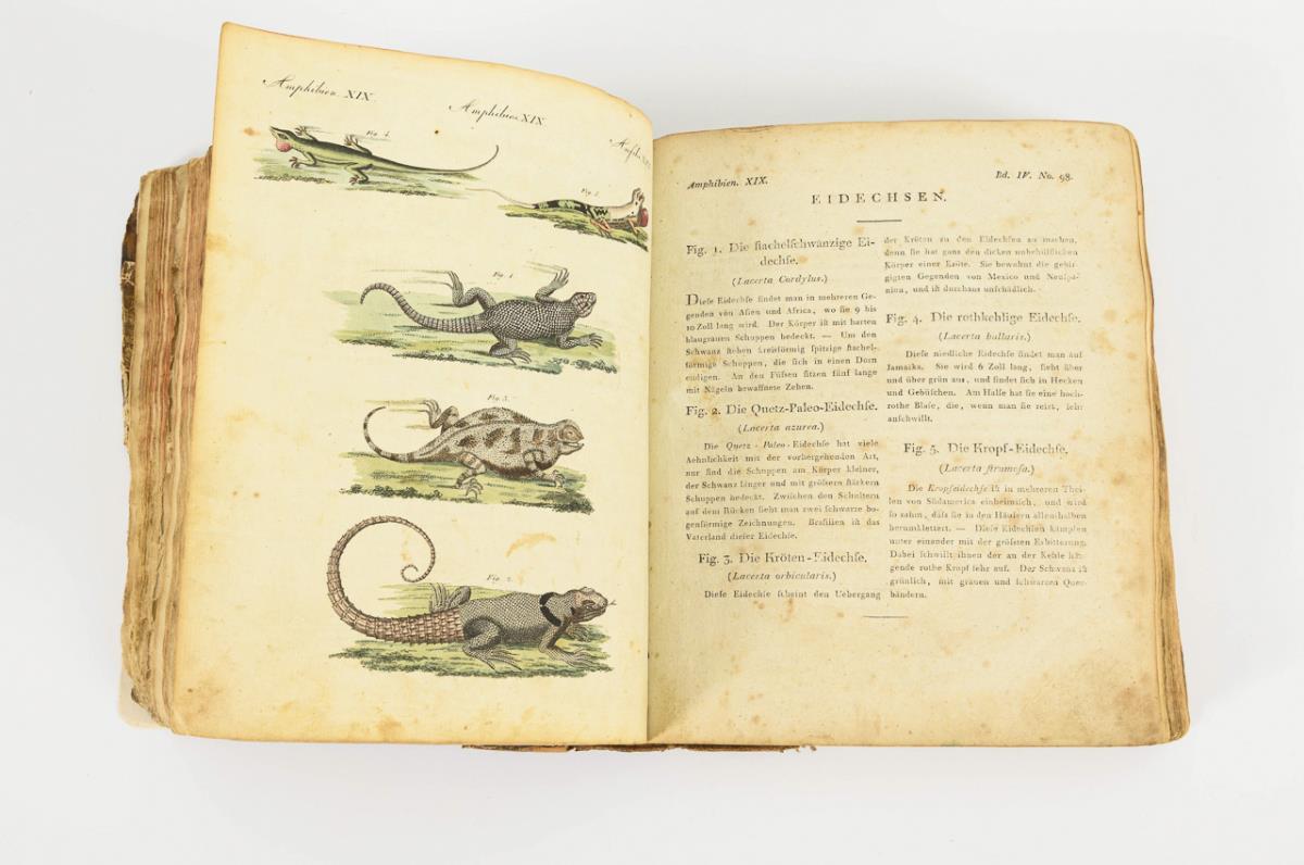 4. Band von 12. Kolorierte Abbildungen von Affen, Wasservögel, Fische, Schlangen, Echsen, Wale, Raupen und Schmetterlinge, Pflanzen aber auch Abbildungen von Herkulaneum, Vulkanen, Pferderennen, Alpen Telegrafie und vieles andere mehr. Zu einer kolorierten Kupferstichseite gehören in der Regel vier Seiten Text mit den Erklärungen in Deutsch, Französisch, Englisch und Italienisch. Nicht durchgehend paginiert, sondern nach Themen gemischt, jedoch gehören alle zum Band 4. Halbledereinband. Eine größere Ecke des Deckels fehlt, Alters- und Gebrauchsspuren aber feste Bindung, Stockflecken.