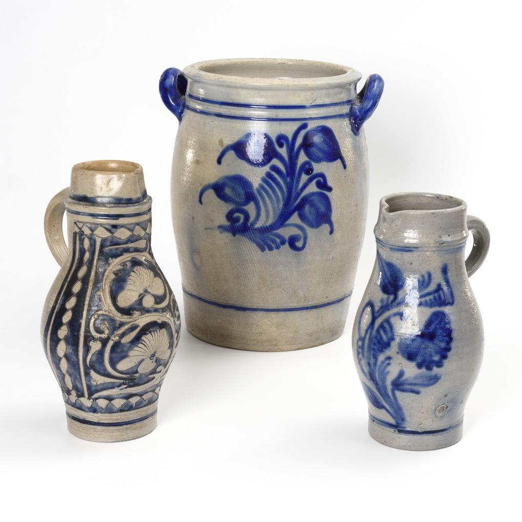 Graues, salzglasiertes Steinzeug mit kobaltblauer Bemalung und teils geritztem Dekor. H 27,5 cm bis 36,5 cm.