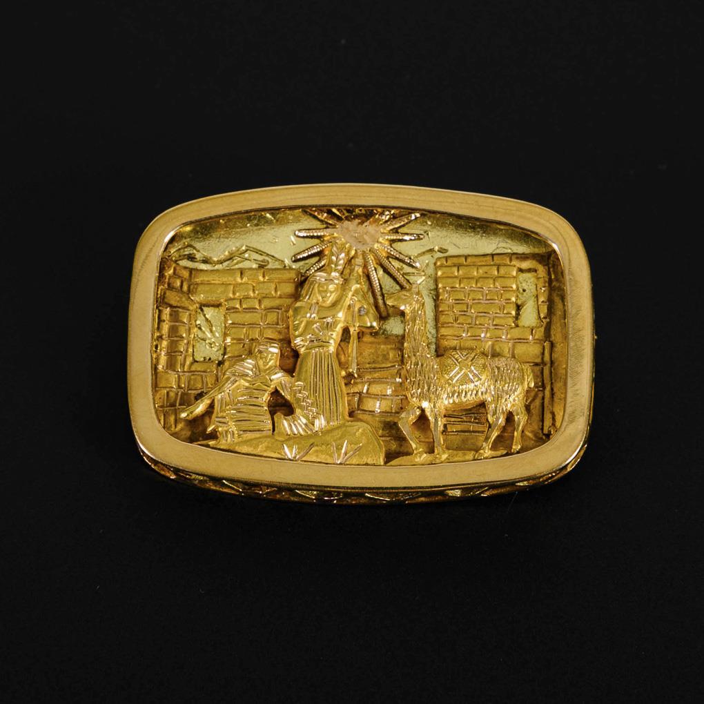 Bildartige Brosche mit südamerikanischem, plastisch gearbeitetem Motiv und seitlicher Randzier. Kugelhaken.