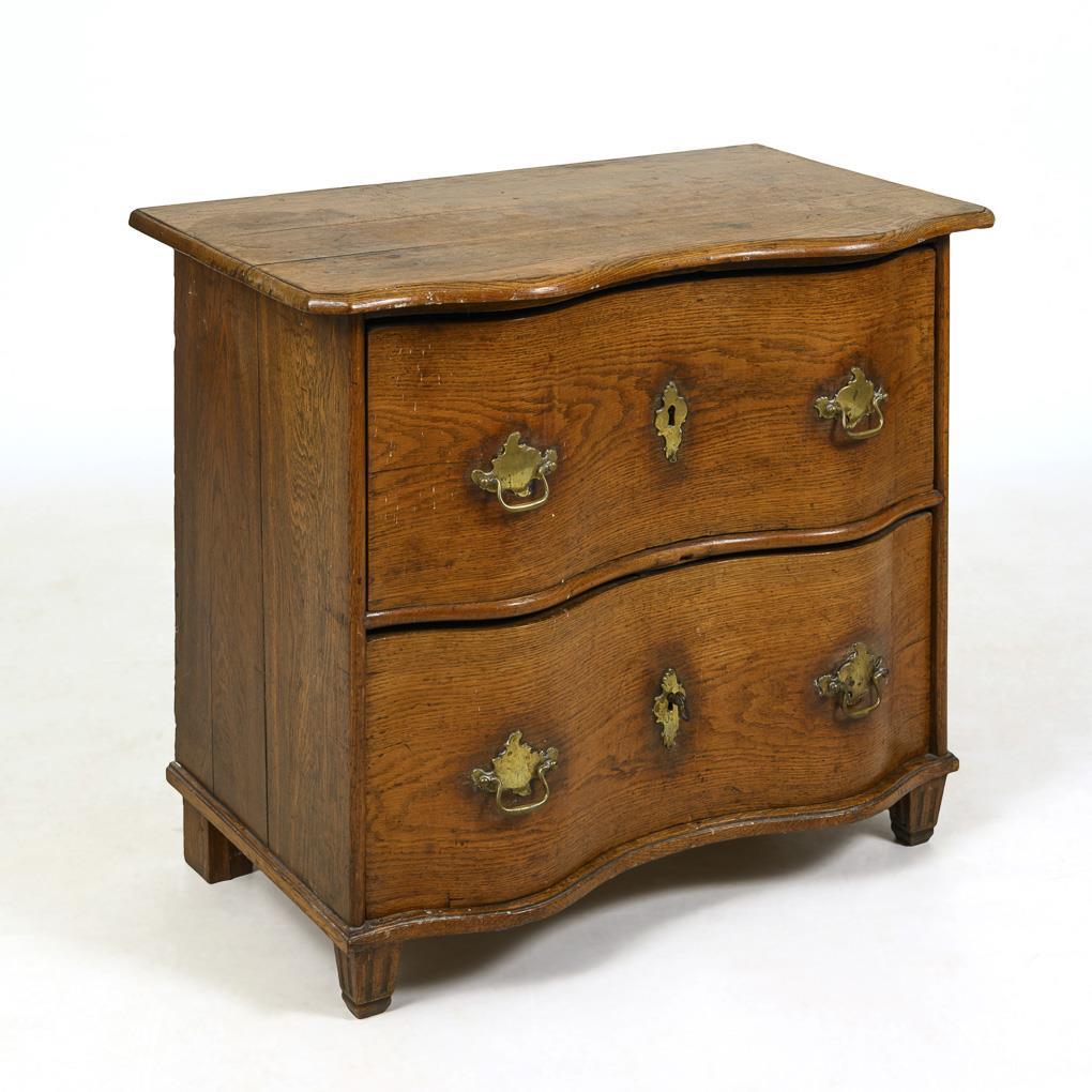 2-schübige Kommode in stiltypisch geschwungener Form, auf kannelierten Pfeilerfüßen, dekoriert mit Messingbeschlägen. Alters-/Gebrauchsspuren, alt restauriert, Trockenrisse.