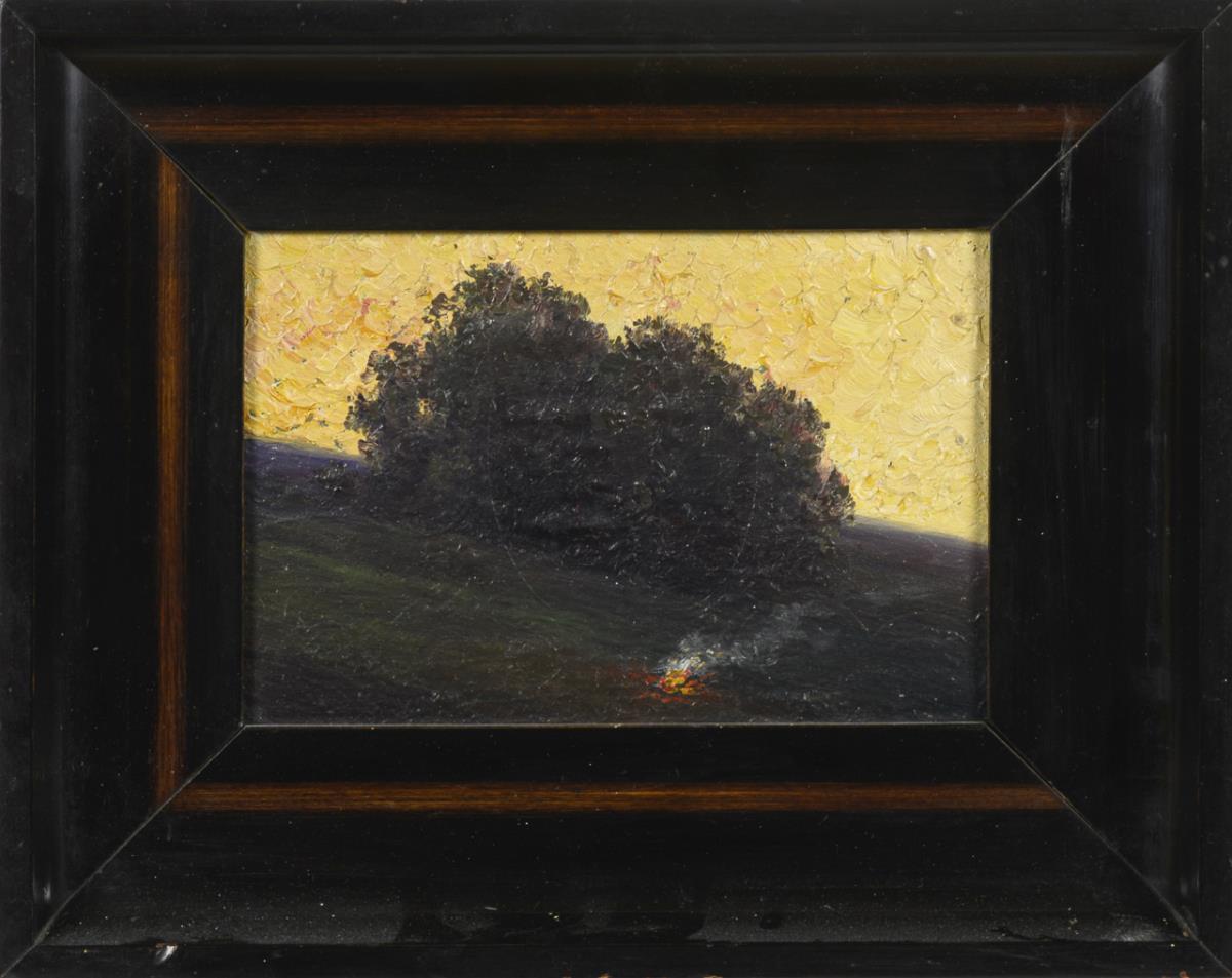 Kleine Abendlandschaft mit Baumgruppe und Lagerfeuer
