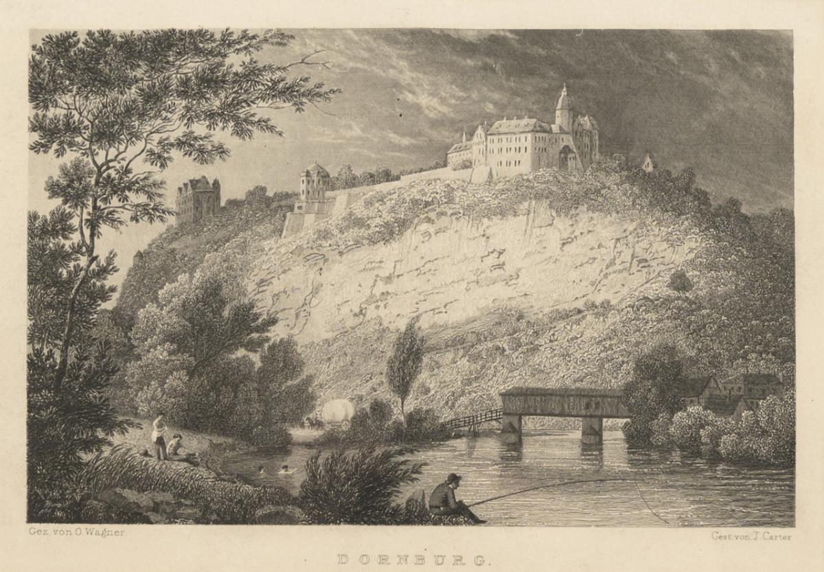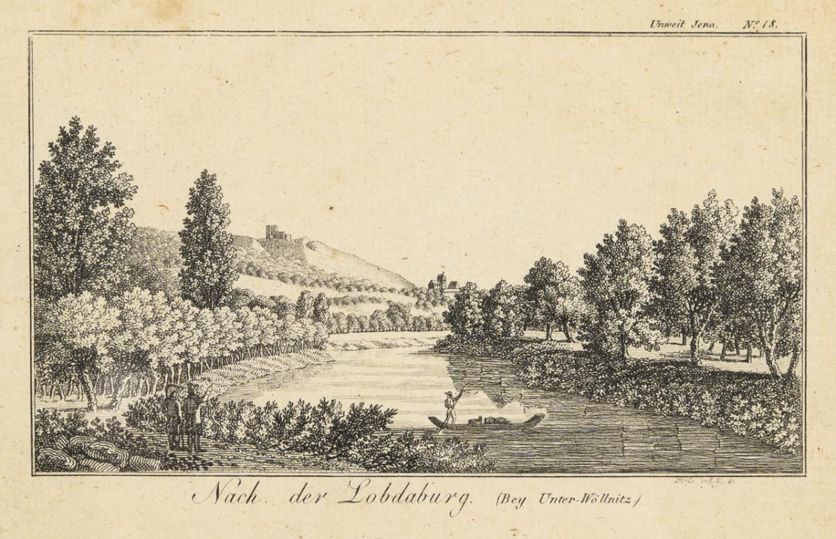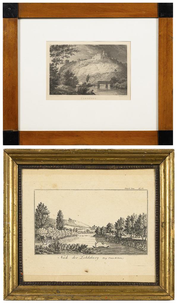 Hess, Christian Carl Ludwig: "Nach der Lobdaburg. (Bey Unter-Wöllnitz)", Kupferstich, Platte: 8,2 x 14 cm, Blatt: 12,5 x 16,5 cm, gerahmt & hinter Glas: 18,5 x 21 cm, Blatt 18 aus der Folge "Unweit Jena.", etwas stockfleckig | Carter, J.: "Dornburg", Stahlstich, Passepartoutausschnitt: 11,5 x 16,5 cm, gerahmt & hinter Glas: 28 x 33 cm.
