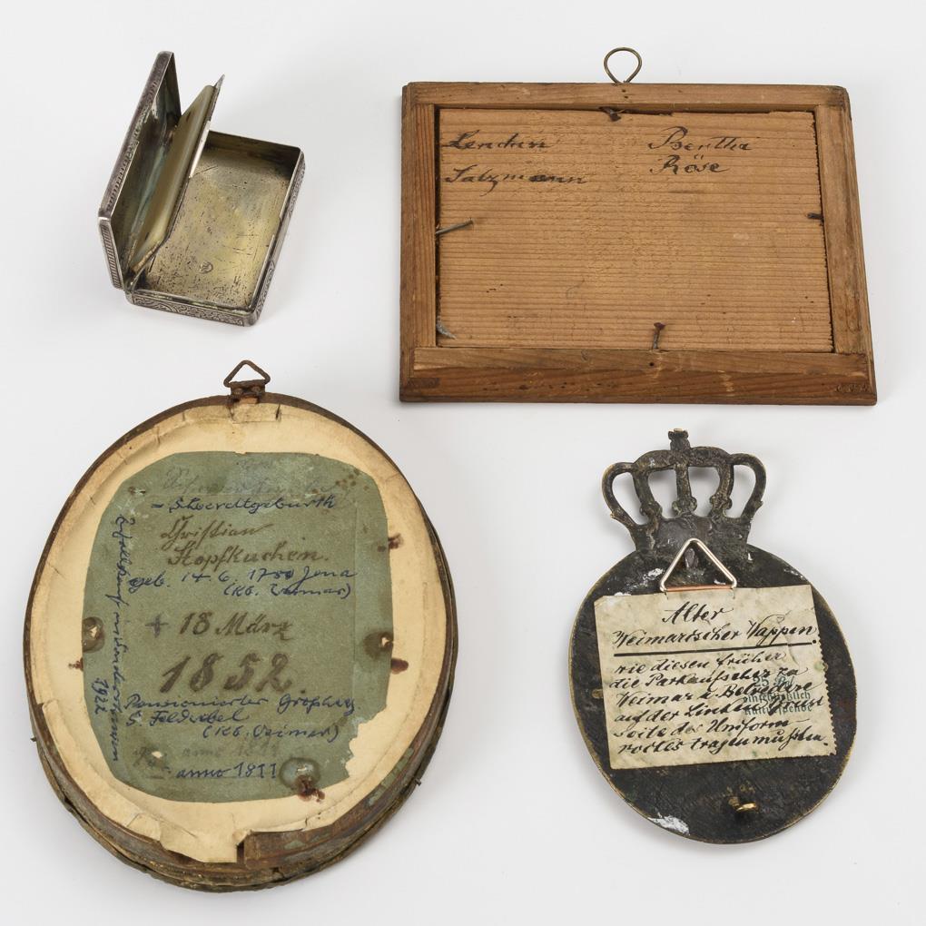 Miniatur des Offiziers "Christian Stopfkuchen" (verglaste Gouache im originalem Messingrahmen, verso bezeichnet/datiert: 1811). / Querovales Silhouetten-Doppelbildnis zweier Frauen (Églomisé mit Radierungen und hellem Lackhintergrund, originaler Holzrahmen, verso bezeichnet). / Bronzewappen des Königreiches Sachsen, verso mit Erklärung: Abzeichen der Parkaufseher in Weimar und Belvedere. / Allseits guillochierte/gravierte Streichholzdose aus Silber (MS gepunzt) mit Perlmutt-Reibe im Binnendeckel. Miniatur: Farbabsplitterungen. Wappen: Lötstellen verso.