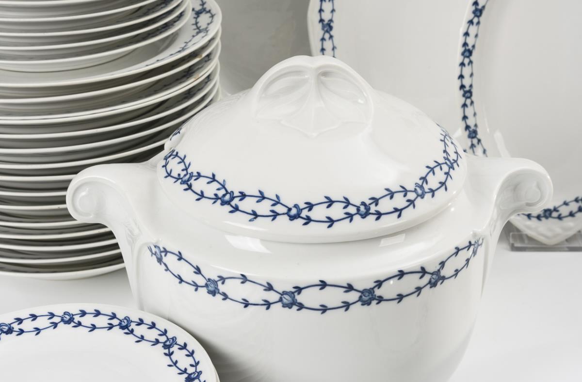 61 Teile. Dekor "564" (bisher als "Rosenranken-Dekor" bezeichnet), Form "1909" (fabrikinterner Name "9" bzw. "Glatt". Entwerfer*in unbekannt. 20 Speiseteller, 12 Suppenteller, 10 Salatteller, 12 Dessertteller, 4 Ovalplatten (L 26,5, 34,5, 41 und 51,5 cm), 1 Terrine (H 22 cm), 1 Ovalschale (L 27 cm) und 1 Sauciere. Minimale Bestoßung am Saucierenrand, 1 Speiseteller und 1 Suppenteller mit Haarrissspinne, 2 Speiseteller, 1 Dessertteller und 2 Salatteller mit Randchip, 1 Suppenteller mit kleiner Randbestoßung.