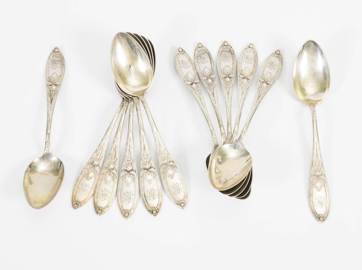 12 Jugendstil-Suppenlöffel in Schatulle. Koch & Bergfeld, Bremen.