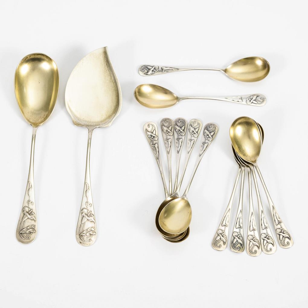 Reliefierte Jugendstil-Blüte am Griff, alle mit vergoldeter Laffe.