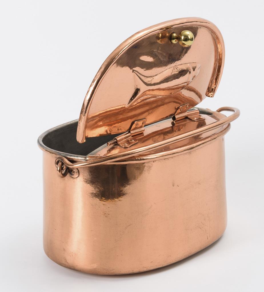 Kupfer teils getrieben, innen verzinnt, Messing-Kugelgriff. 21 x 34 x 24 cm (ohne Henkel). 3,2 kg.
