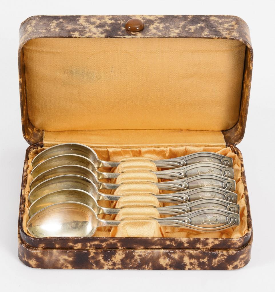 6 Jugendstil-Kaffeelöffel im Etui. W. Schwechten, Berlin.