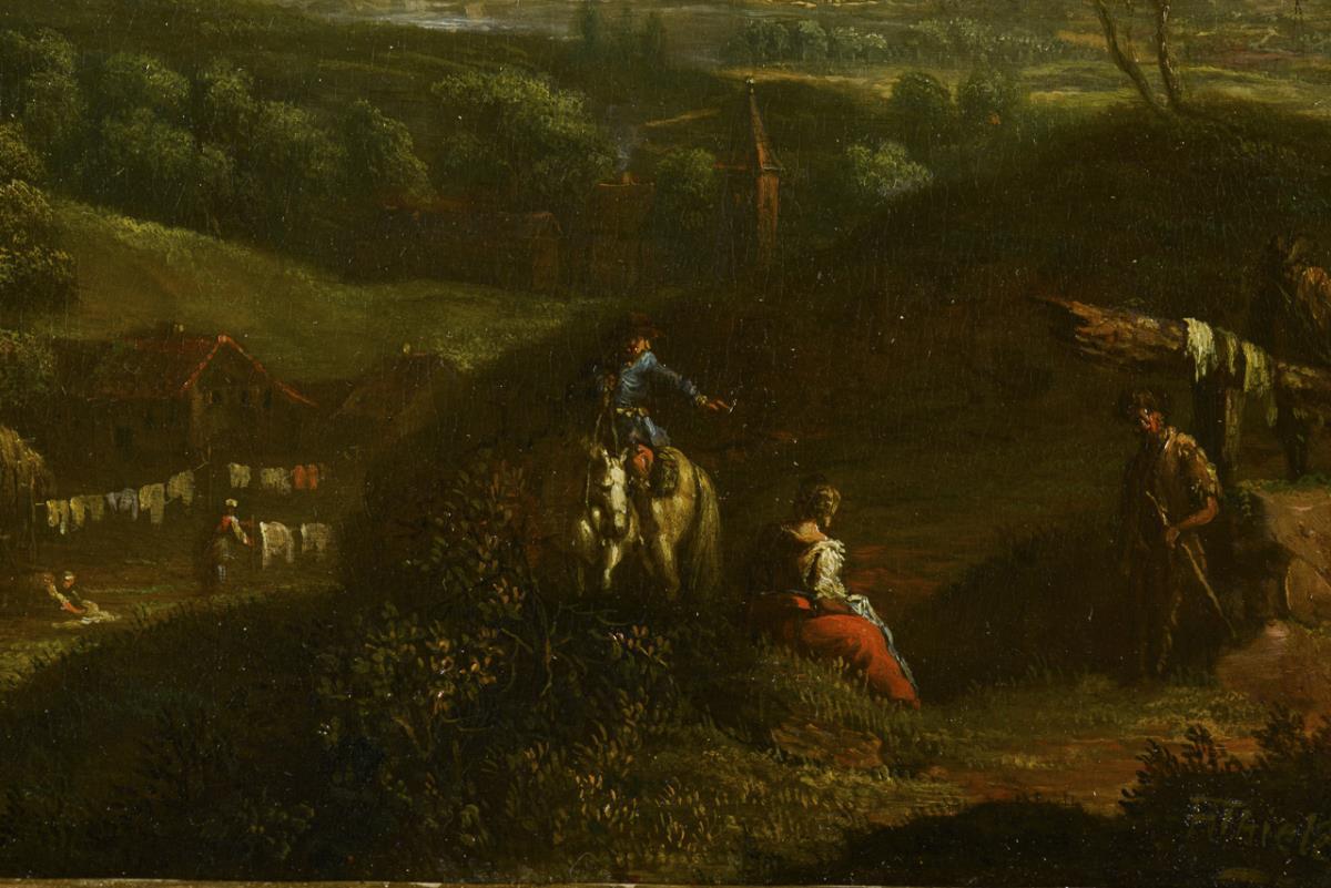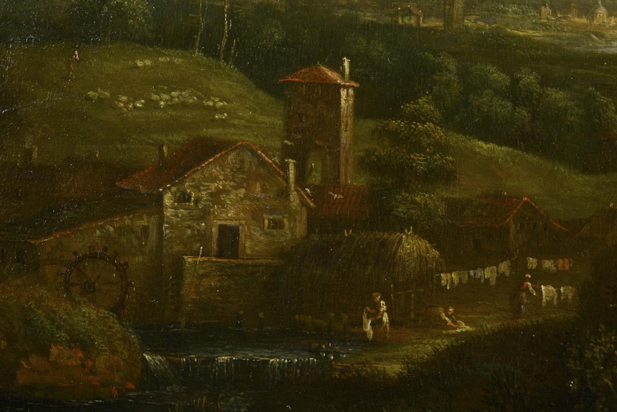 Weite Flusslandschaft mit Wassermühle und Staffagefiguren sowie Blick in die Weite zu einer Stadt unter leicht bewölktem Himmel. | Nachtrag 25.02.2023: Es handelt sich um Johann Friedrich Alexander Thiele (1747 Dresden - 1803 ebd.), Sohn des Johann Alexander Thiele.