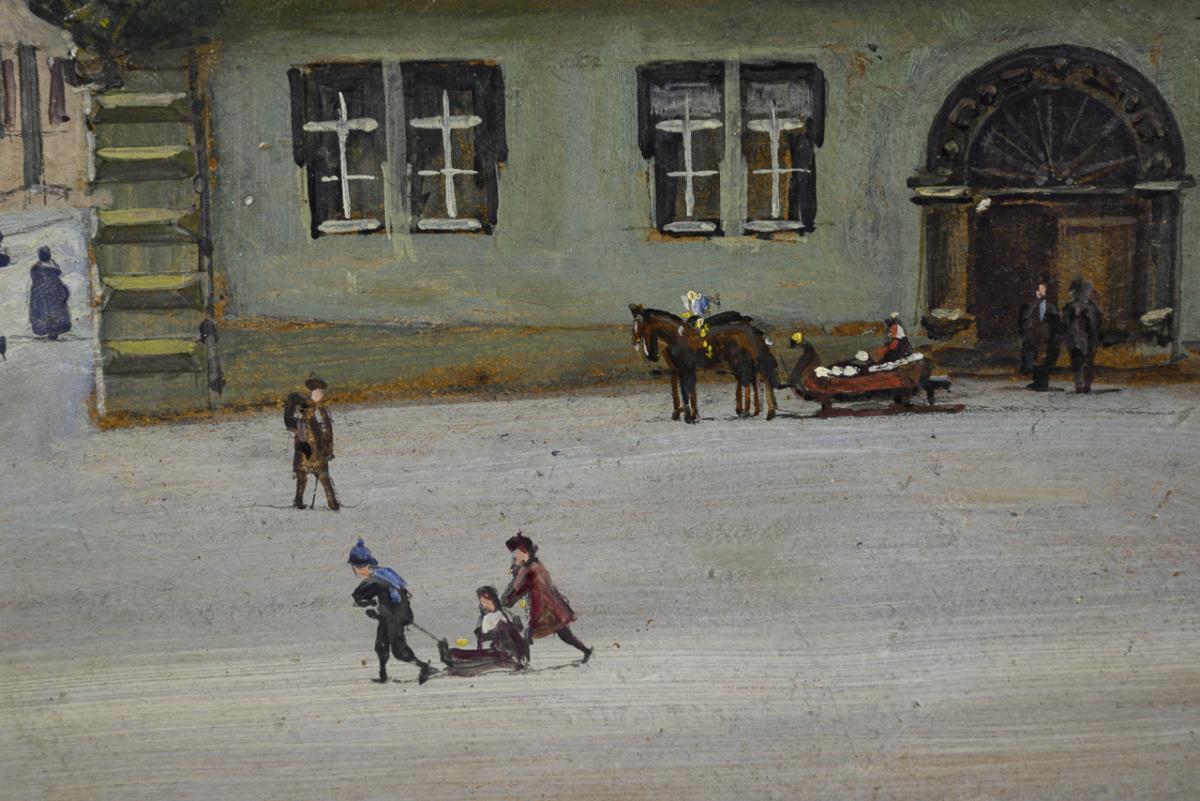 Blick auf den Platz mit wenigen Personen an einem sonnigen Wintertag.