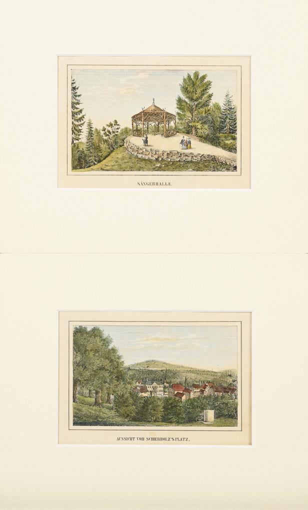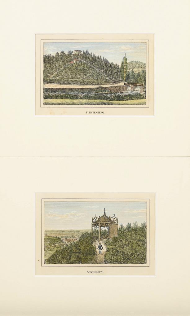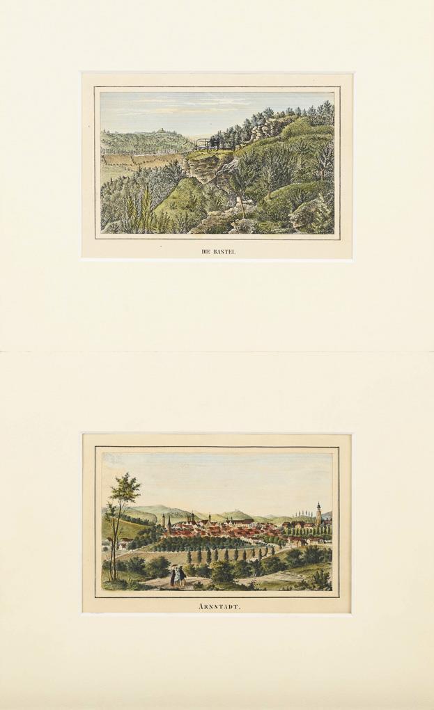 "Arnstadt" | "Die Bastei" | "Wasserleite" | "Fürstenberg" | "Liebfrauenkirche" | "Schloss-Ruine Neideck" | "Aussicht vom Schierholz's Platz" | "Sängerhalle" | "Eremitage" | "Der Jungfernsprung im Jonasthale" | "Ritterstein und Schnecke" | "Schönbrunnen" | "Harmonie" | "Concordia" | Plauescher Grund" | "Dorotheenthal und Käfernburg". Je lichtgebräunt.