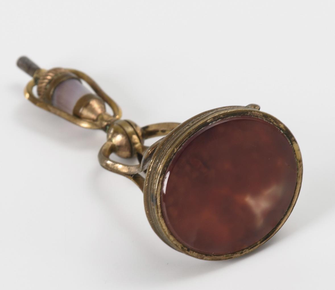 Ungravierte Siegelplatte; darüber eine drehbare Abhängung mit Achat (wohl Taschenuhrenschlüssel). Kaum Alters-/Gebrauchsspuren.