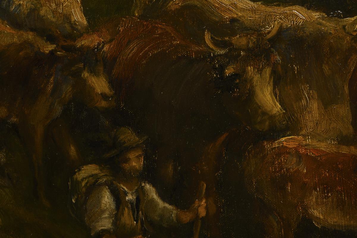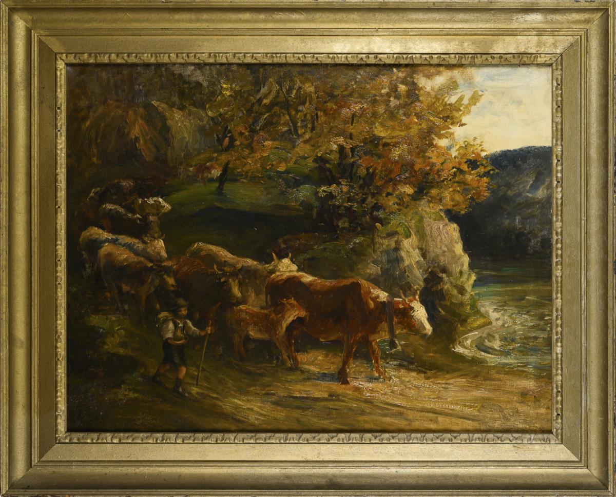Hirte mit den Tieren auf einem Weg aus dem Wald heraus hinab zum Flussufer.