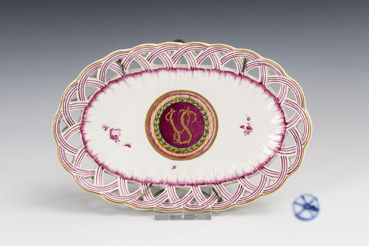 Ovale Schale mit bogenartig geflochtenem Rand. Im Spiegel ein gold- und lorbeerkranzgerahmtes Medaillon mit Purpurfond und dem goldgravierten Monogramm "VS".