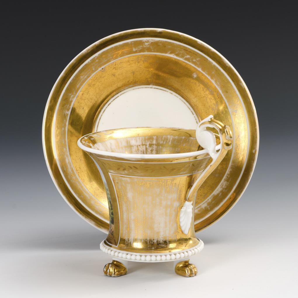 Kratertasse mit Perlband, drei Tatzenfüßen und Rosettenhenkel. Schauseitig eine goldgerahmte Rechteckkartusche mit der fein gemalten Darstellung einer Flusslandschaft mit Architektur, Boot und Wäscherin am Flussufer. Gold berieben, 1 Tatzenfuß bestoßen.