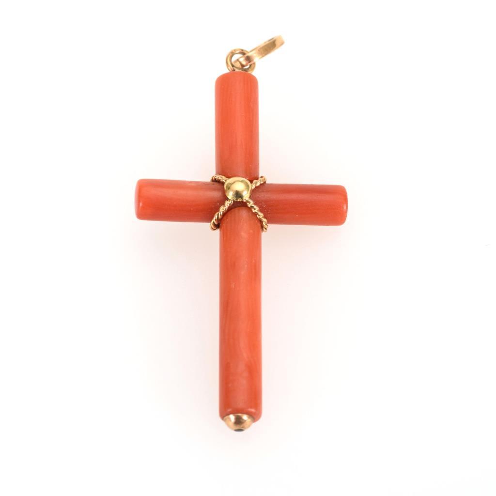 Lachsfarbenes, aus Korallenstegen gearbeitetes Kreuz (rückseitig kleiner Chip) mit Kordelmontierung.