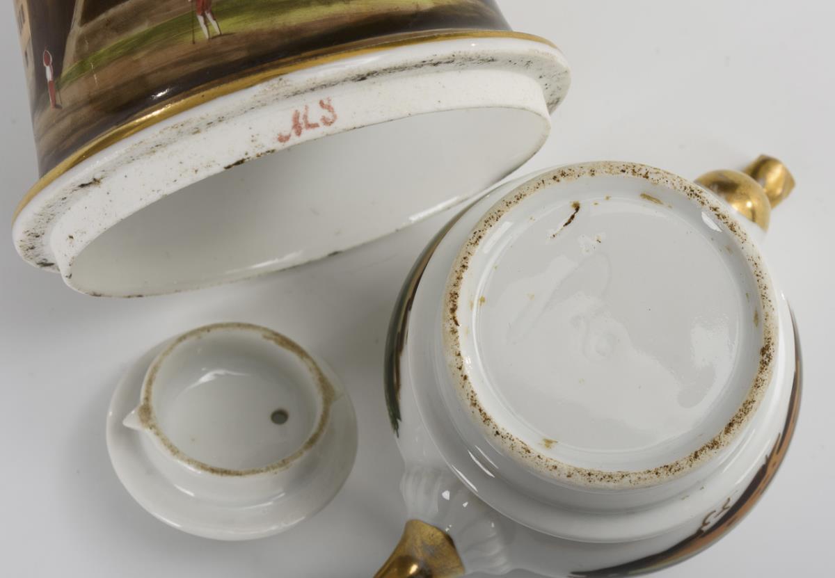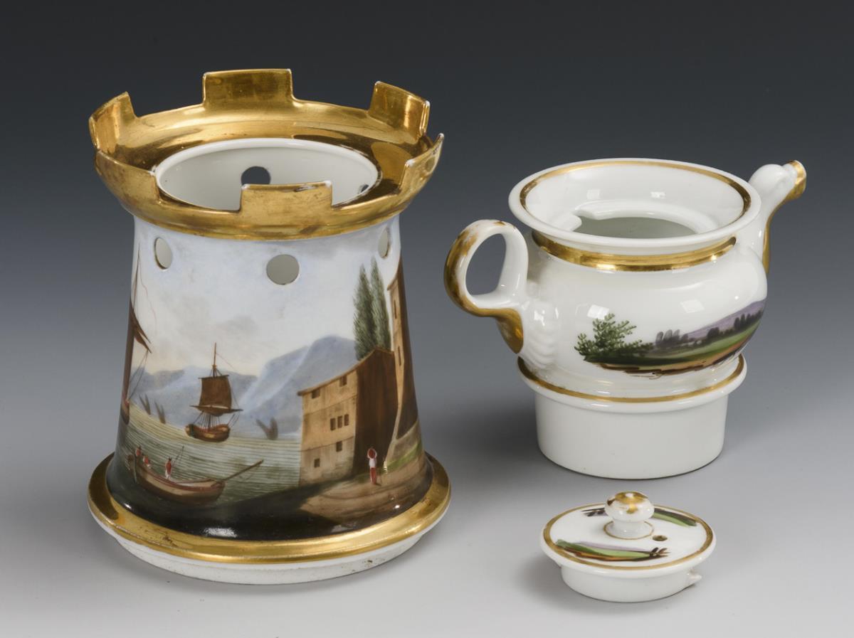Konisches Stövchen mit zinnenartigem Rand und einer umlaufend dargestellten Küstenlandschaft mit Segelschiffen, Architektur und Personenstaffage. Mit kleinem Kännchen mit Tierkopfröhrenausguß und beidseitiger Landschaftsmalerei. Partieller Goldabrieb, Fuß fehlt.