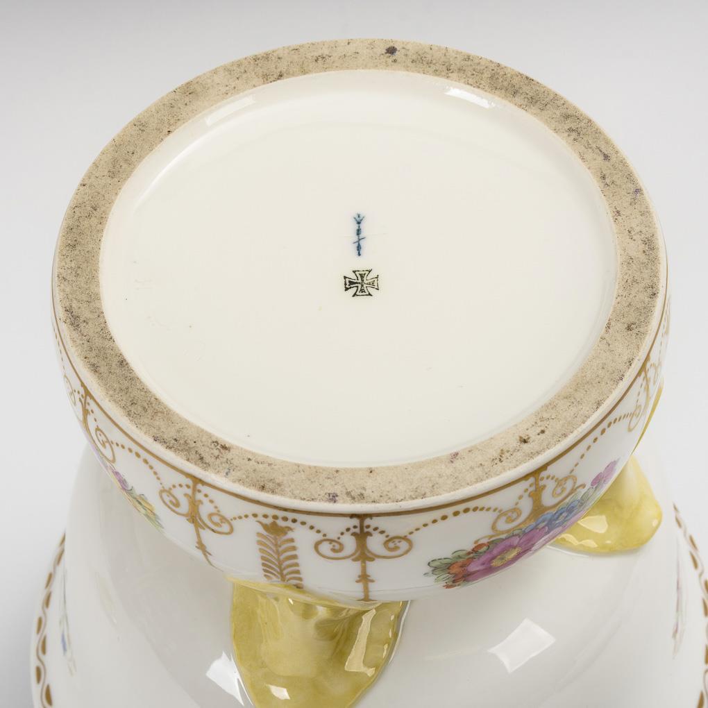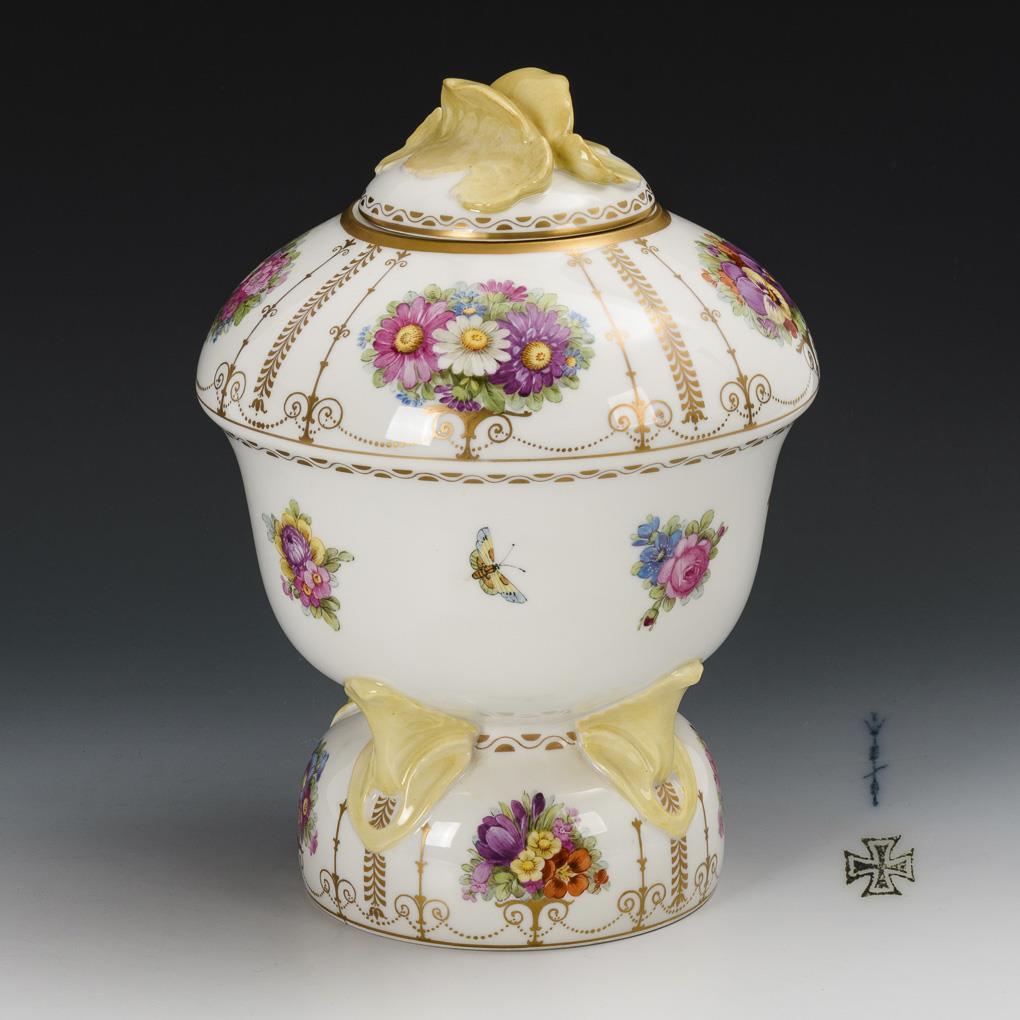 Bauchige Vase mit vier Füßen auf festem, gewölbtem Sockel, Deckel mit Blütenhandhabe. Auf der Wandung Blumenbuketts, kleine Insekten und goldene Ornamentik.