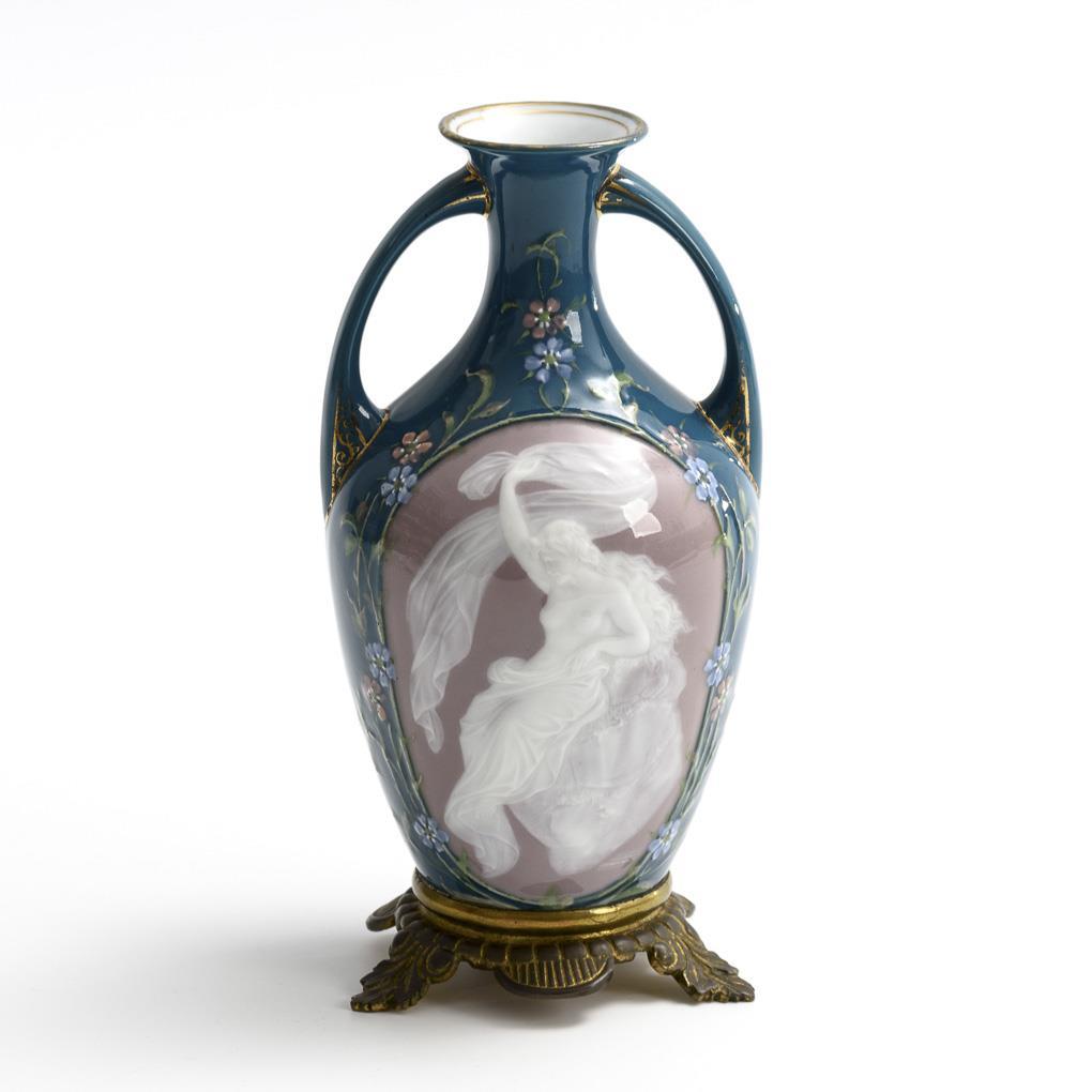 Balustervase mit zwei bogenförmigen Henkeln und bronzemontiertem Fuß. Blauer Fond, schauseitig ein von reliefgemalten Blüten gerahmtes Medaillon mit bräunlichem Fond und der Darstellung einer am Felsen lehnenden jungen Frau mit nacktem Oberkörper und Tuchdraperie. Minimaler Goldabrieb am Rand.