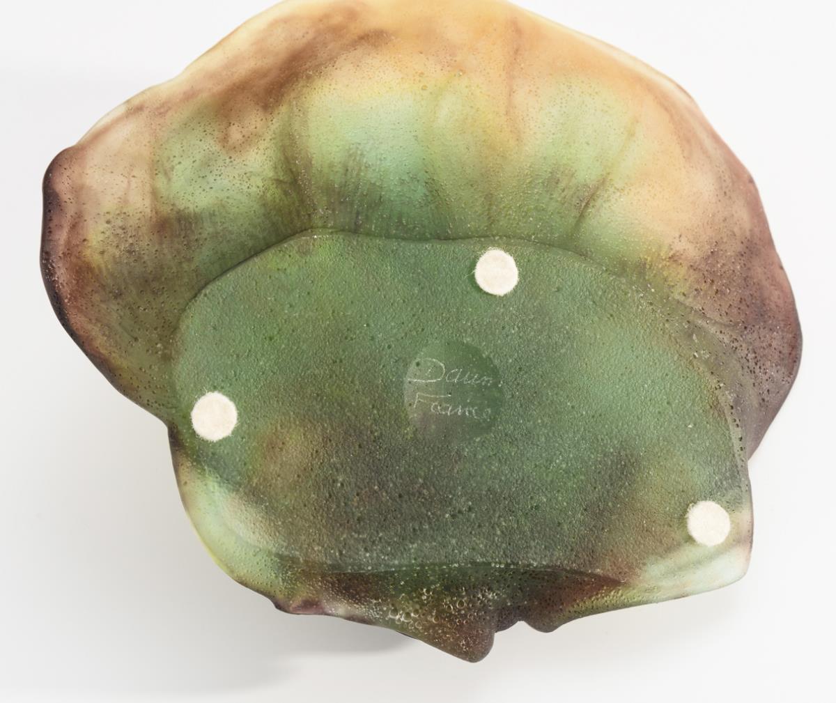 Pate de verre. Farbloses Glas mit grünen, violetten und gelb-braunen Farbeinschmelzungen. H 6,5 cm, Ø 15 cm.