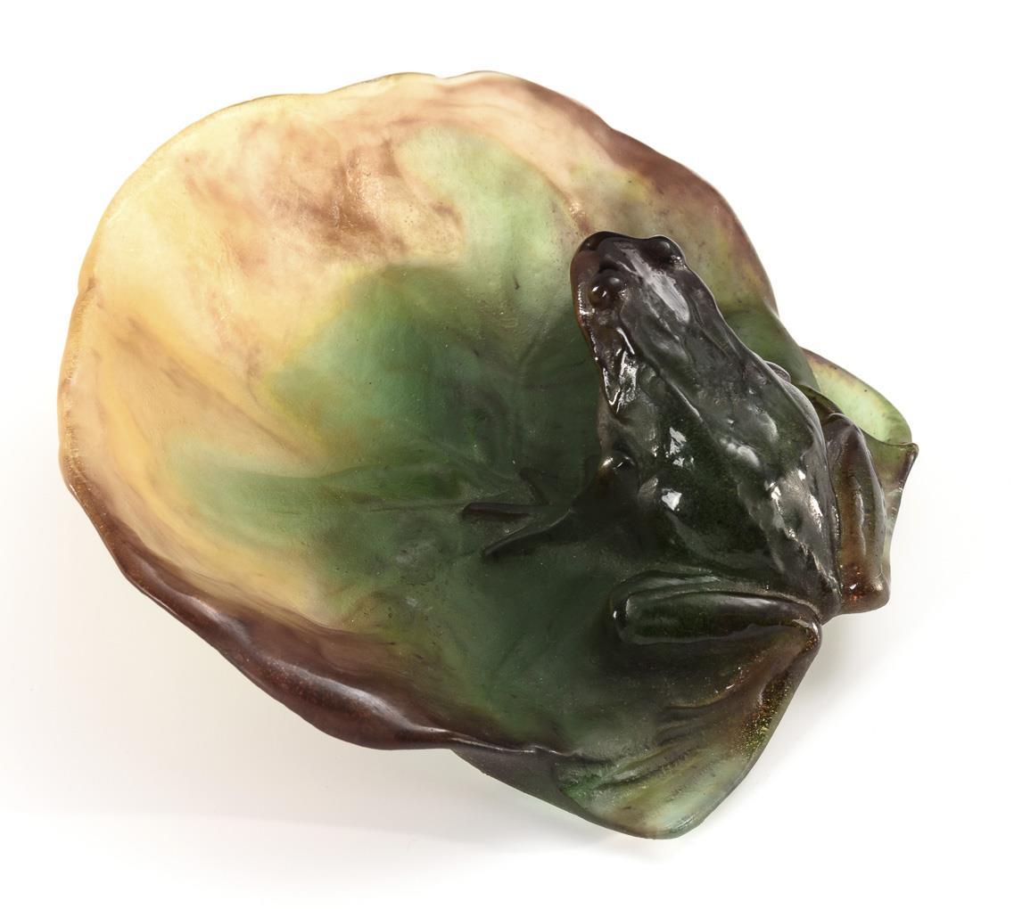 Schale in Form eines Seerosenblattes mit einem auf dem Rand sitzenden Frosch.