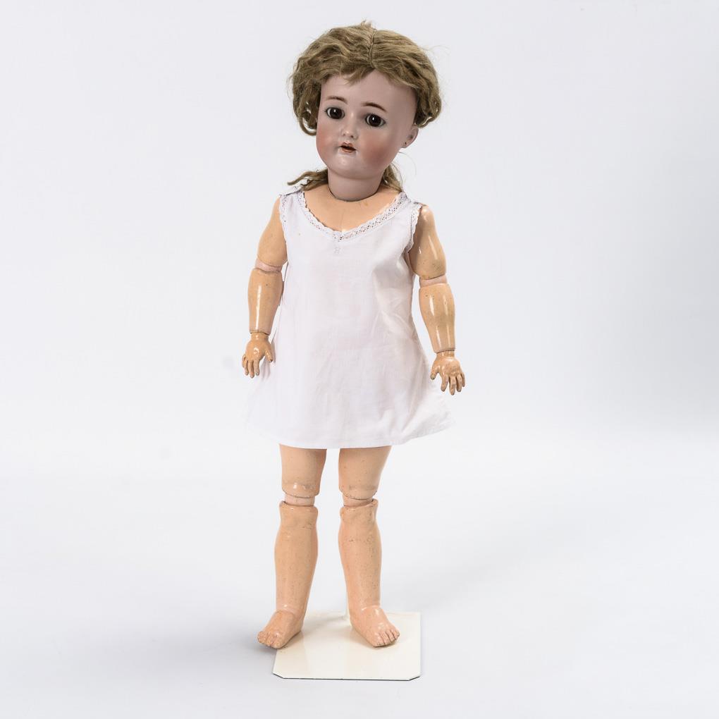 Kurbelkopf, braune Schlafaugen, Ohrlöcher, blonde Mohairperücke. 15-teiliger Gliederkörper mit rotem Stempel "Heinrich Handwerck Germany". Weißes Unterkleidchen. Kopf durchleuchtet: ohne Defekte. Körper bespielt, mit kleinen Farbdefekten.