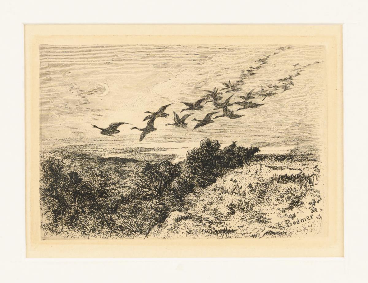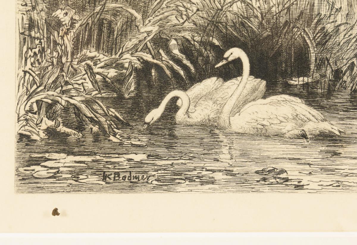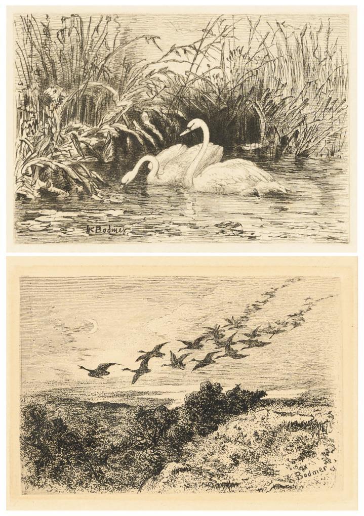 Schwanenpaar im Schilf, Platte: 12 x 16,5 cm, Blatt: 16,5 x 24,5 cm, im Passepartout: 33 x 37 cm, Blatt beschnitten, Rand leicht gebräunt, etwas stockfleckig | Vogelzug über Seenlandschaft, Platte: 10 x 14,5 cm, Blatt: 15 x 25 cm, im Passepartout: 33 x 36,5 cm, Blatt beschnitten, Blatt gebräunt.