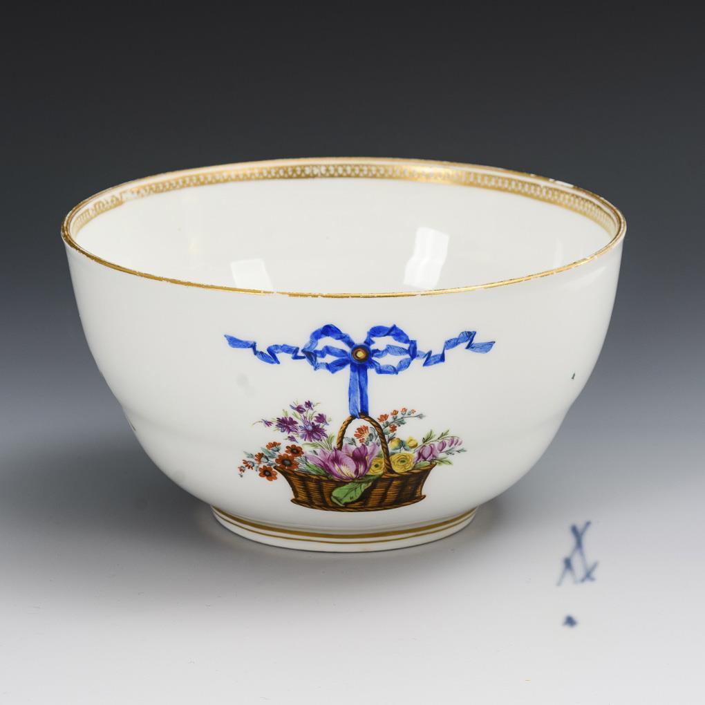 Beidseitig die Darstellung eines von einem blauen Schleifenband gehaltenen Blumenkorbes. Gold etwas berieben.