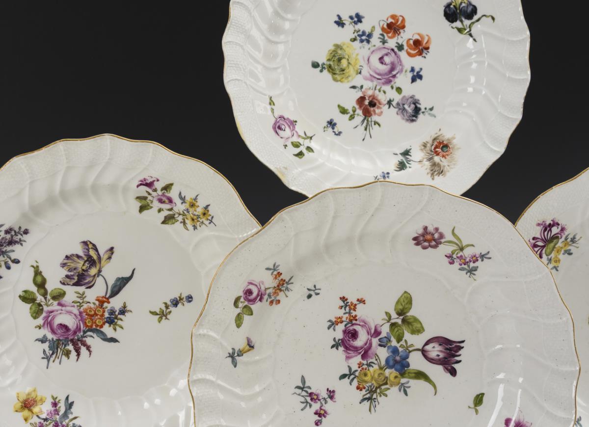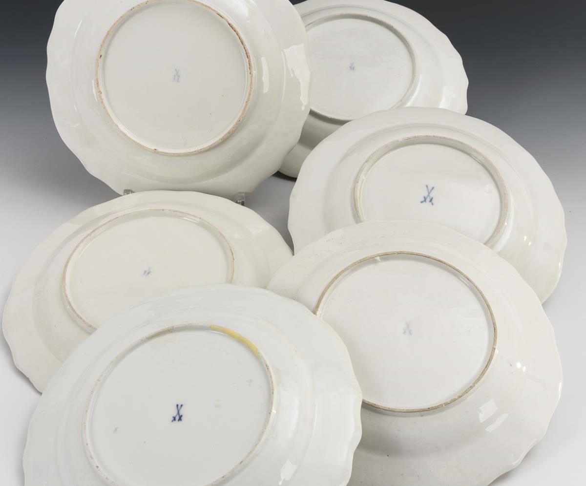 6 barocke Speiseteller mit Blumenmalerei. Meissen.