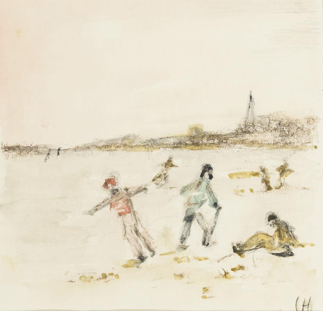 Mehrere Personen am Wasser nahe einer Ortschaft unter hellem Himmel.