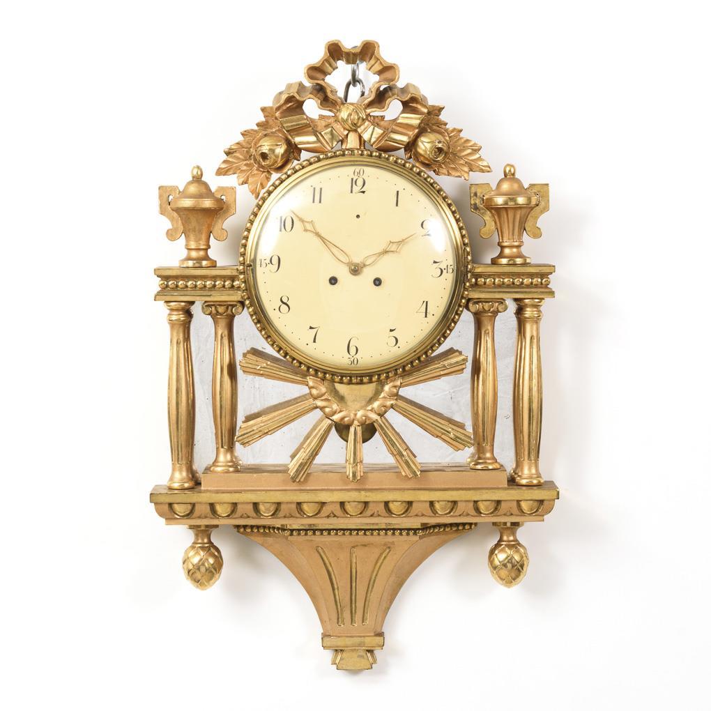 Im Barock-Stil gestaltete Wanduhr mit bekrönender Schleife, seitlichen Vasen, verspiegelter Rückwand und Konsolstück mit Zapfen. Leichte Alters- und Gebrauchsspuren, partiell minimale Defekte.