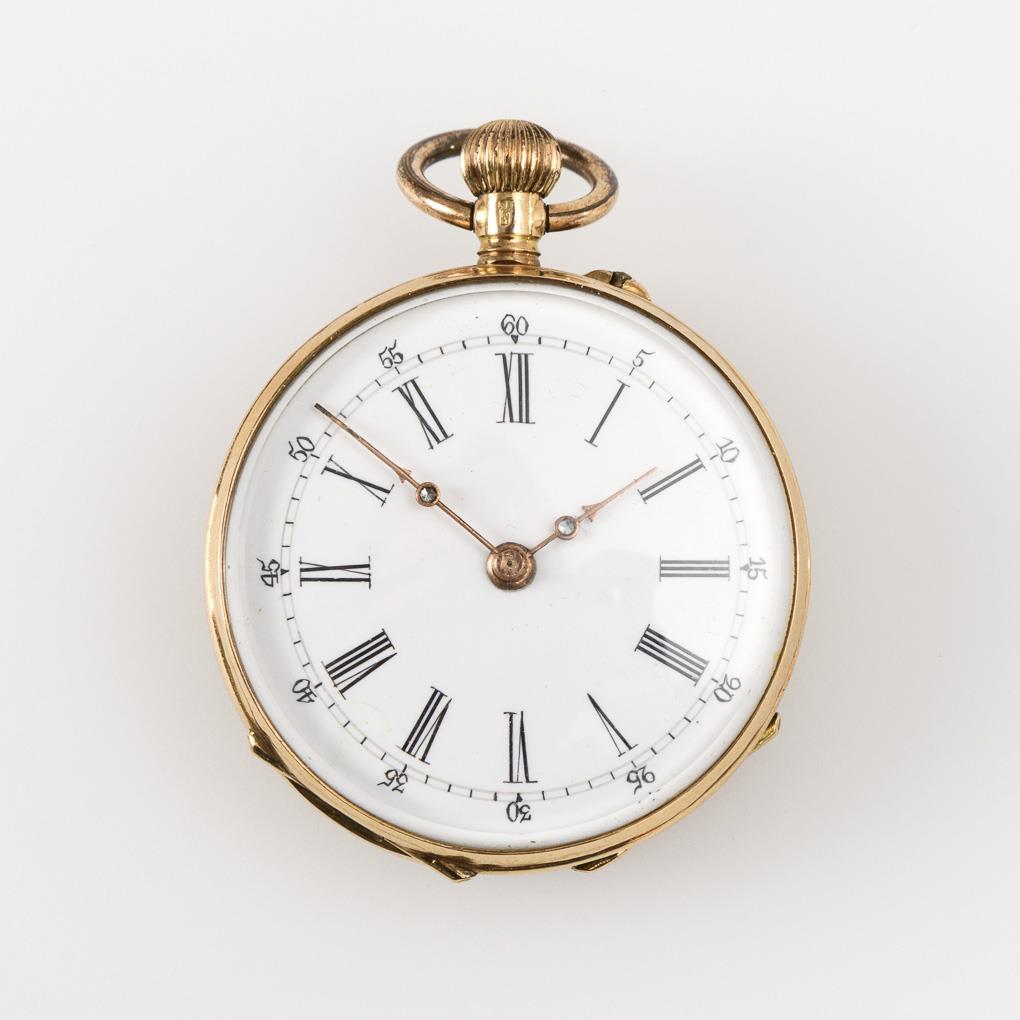 Ungemarktes Werk mit Zylinderhemmung, Reifenunruh, Steinen, Kronenaufzug, läuft. Weißes Emailzifferblatt mit römischen und arabischen Zahlen, Minutenkranz und Pfeil-Zeigern mit Steinchen.