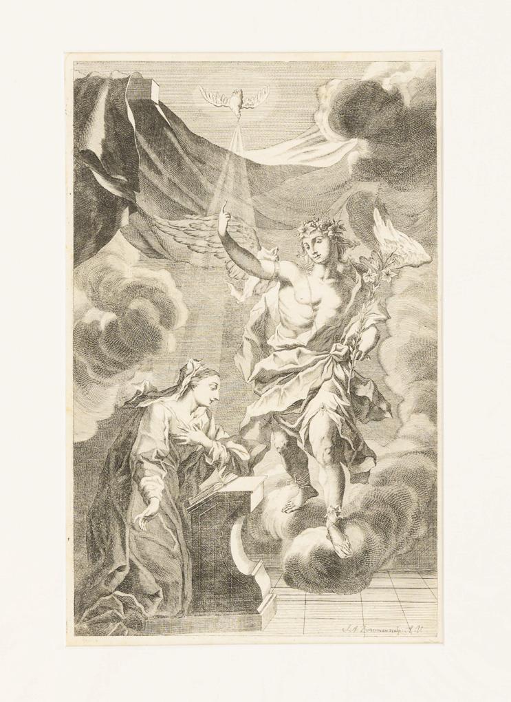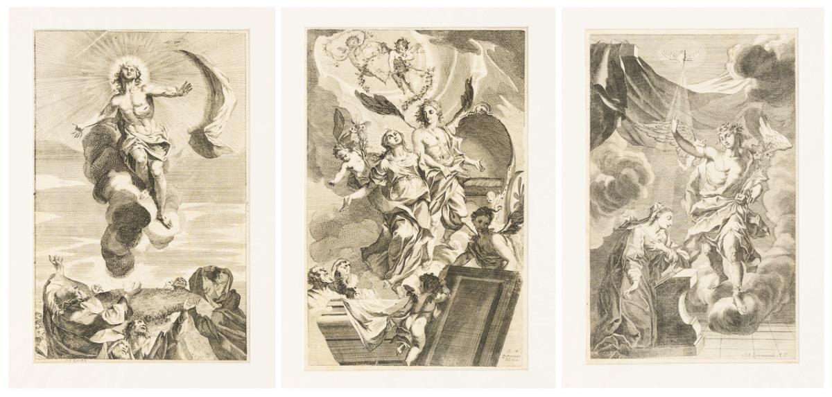 Mariä Himmelfahrt | Maria Empfängnis und Christi Himmelfahrt; 3 blattgroße Kupferstiche aus: "Missale. Novum Missale Romanum Ex Decreto Sacrosancti Concilii Tridentini Restitutum [...], [1740], verso je mit typografischem Text in lateinischer Sprache. Je griffspurig, fleckig und stockfleckig.