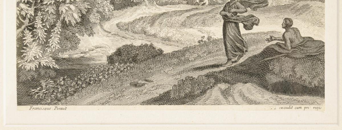Idyllische südländische Landschaft mit Wanderer und Rastenden am Fluss. | Nachtrag 03.03.2023: Es handelt sich um Francisque Millet (1666 - 1723). Platte beschnitten, Blattrand griffspurig.
