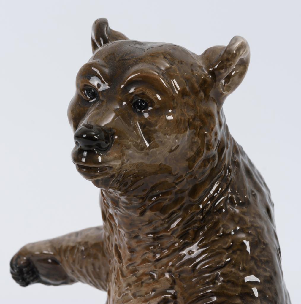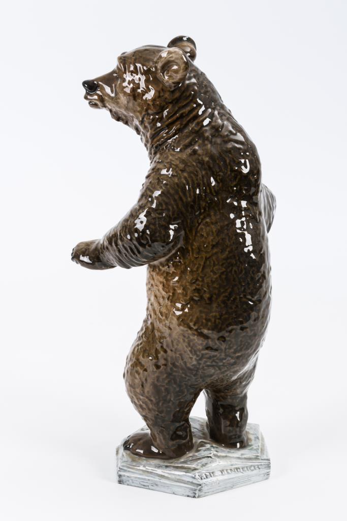 Stehender Braunbär auf sechseckiger Plinthe.