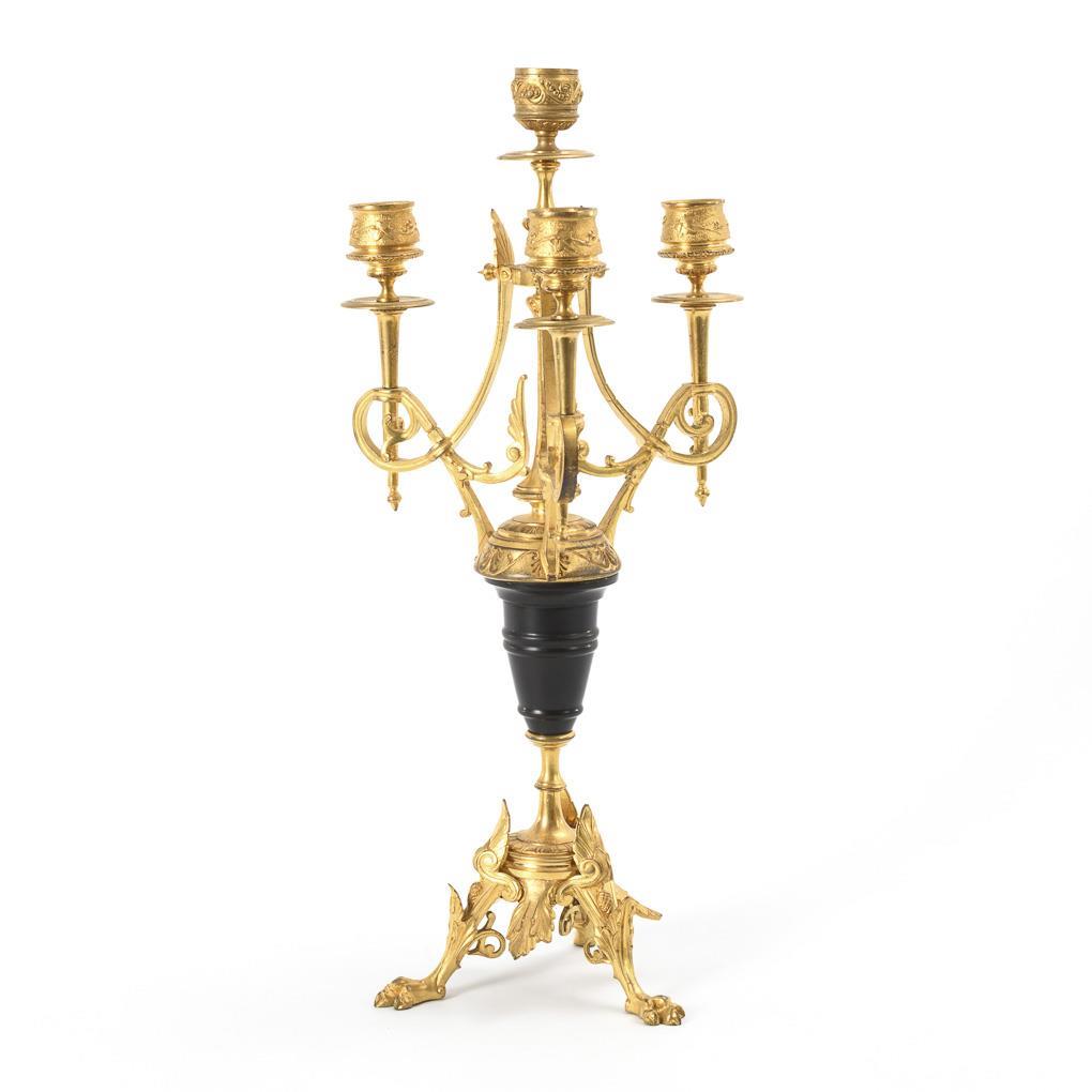 Kerzenleuchter mit 3 Klauenfüßen und Blattbesatz, kurzer Balusterschaft aus Marmor sowie Strebewerk mit 3 Armen und zentral erhöhter Tülle. 1 Arm angebrochen.