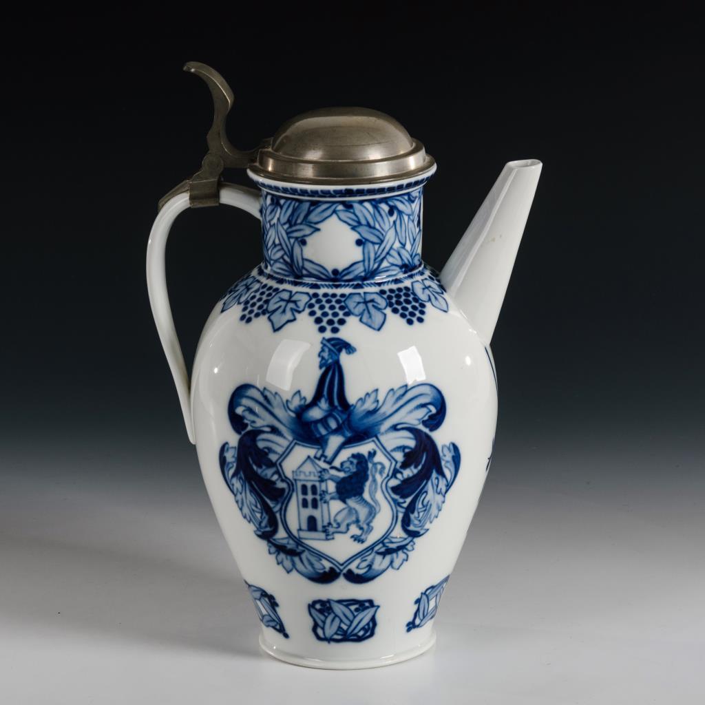 Entworfen zum 200jährigen Jubiläum der Porzellanmanufaktur Meissen. Balusterform, Bandhenkel, Röhrenausguß und Zinndeckel. Röhrenausguß restauriert.