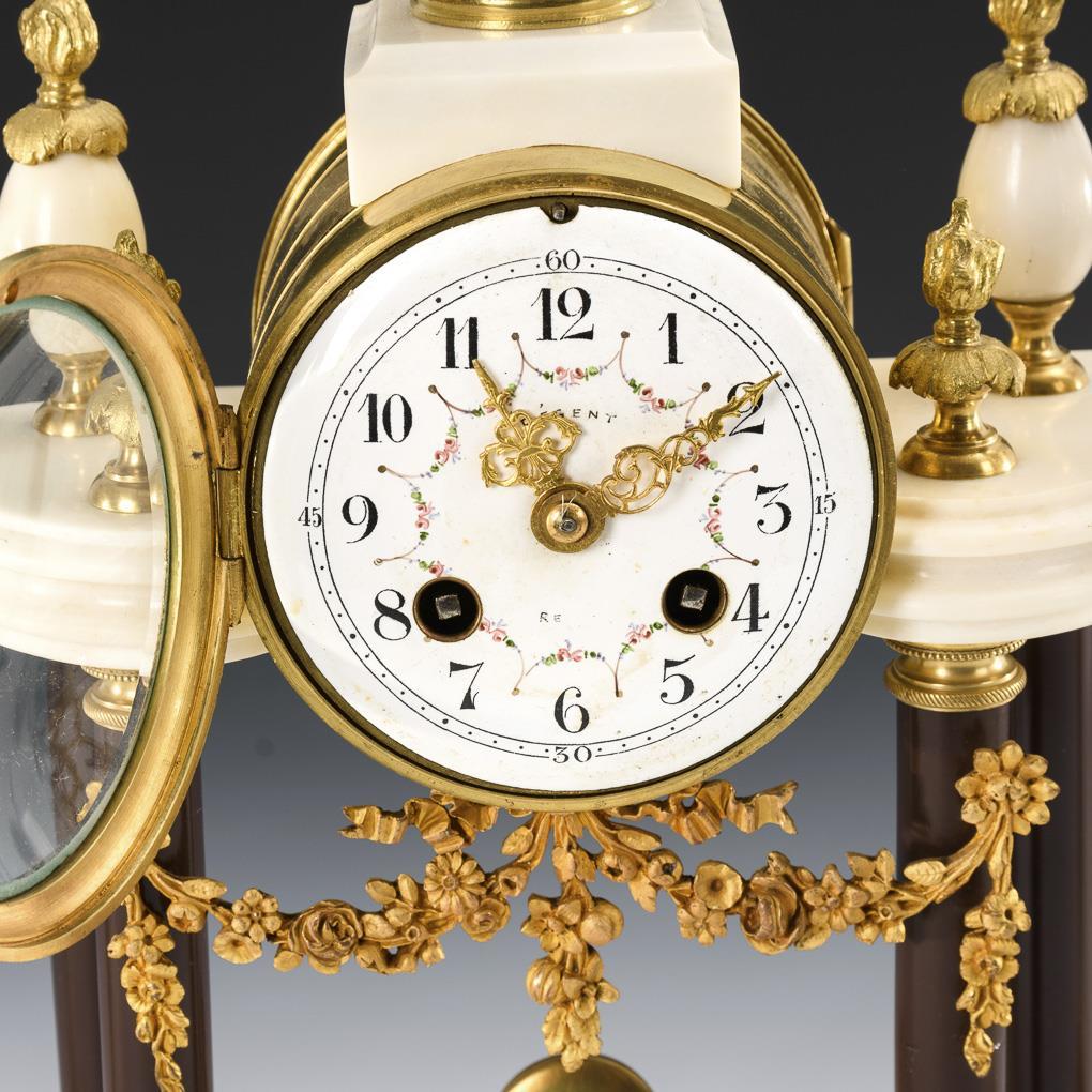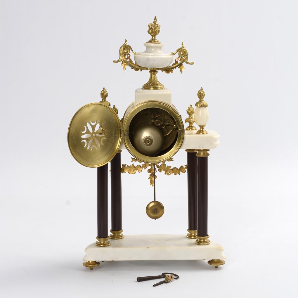 Portaluhr mit 4 Säulen und Vasenbekrönung im Louis Seize-Stil. Dazu ein Paar 5-flammige Leuchterbeisteller mit Flammenlöschern. Leicht berieben, 1 Leuchter mit Bestoßung.