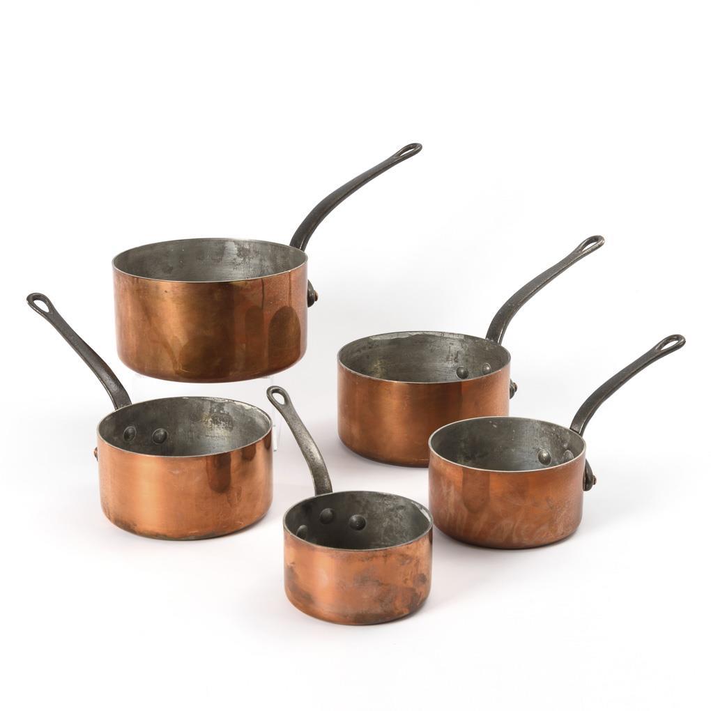 Kupfer innen verzinnt, Gusseisen-Griffe. H 7 - 11 cm, Ø 12 - 20 cm (je ohne Griffe). Zusammen 6,9 kg.