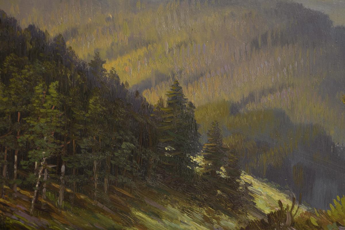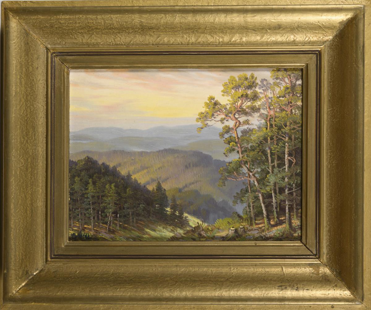 Blick über die bergige Waldlandschaft im Sonnenschein.
