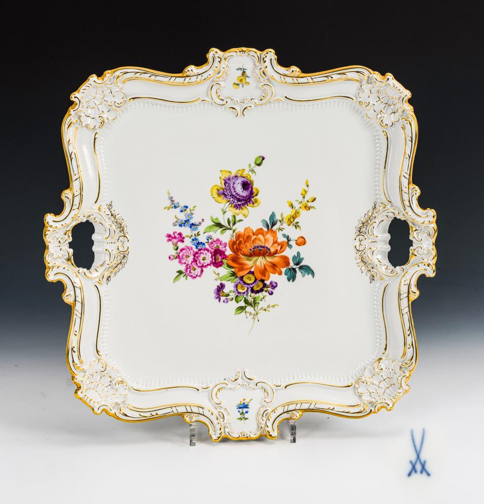 Quadratisches Tablett mit 2 Handhaben und Rocaillerelief. Im Spiegel ein Blumenbukett mit Mohn.