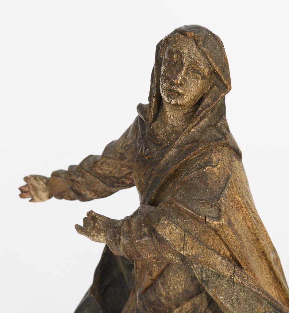 Qualitativ hochwertig geschnitzte vollplastische Standfiguren (Maria und Johannes?) mit ausdrucksstarken Gesten und überaus faltenreichen Gewändern. Fehlstellen, kleinere Ergänzungen, teils Trockenrisse, starke Alters-/Gebrauchsspuren.
