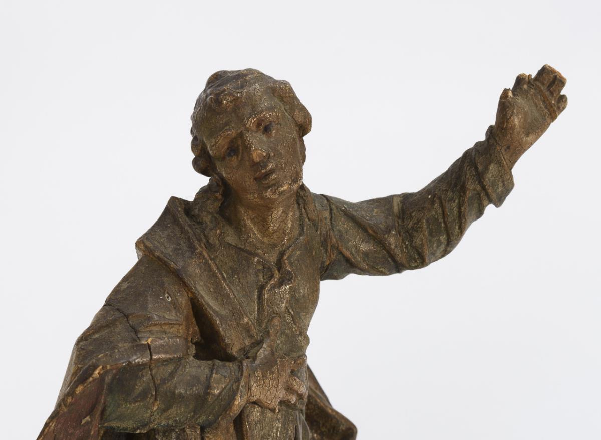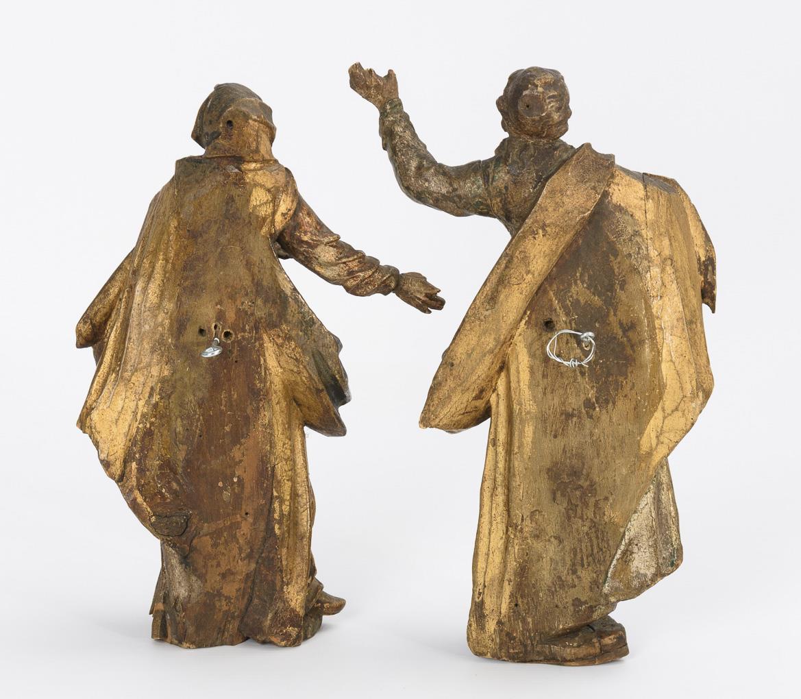Weichholz mit Resten einer Fassung (teils lüstriert). 18. Jh. H 28,5 bzw 27 cm.