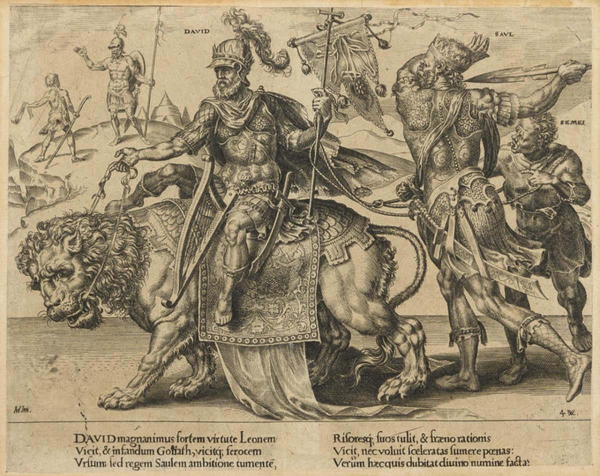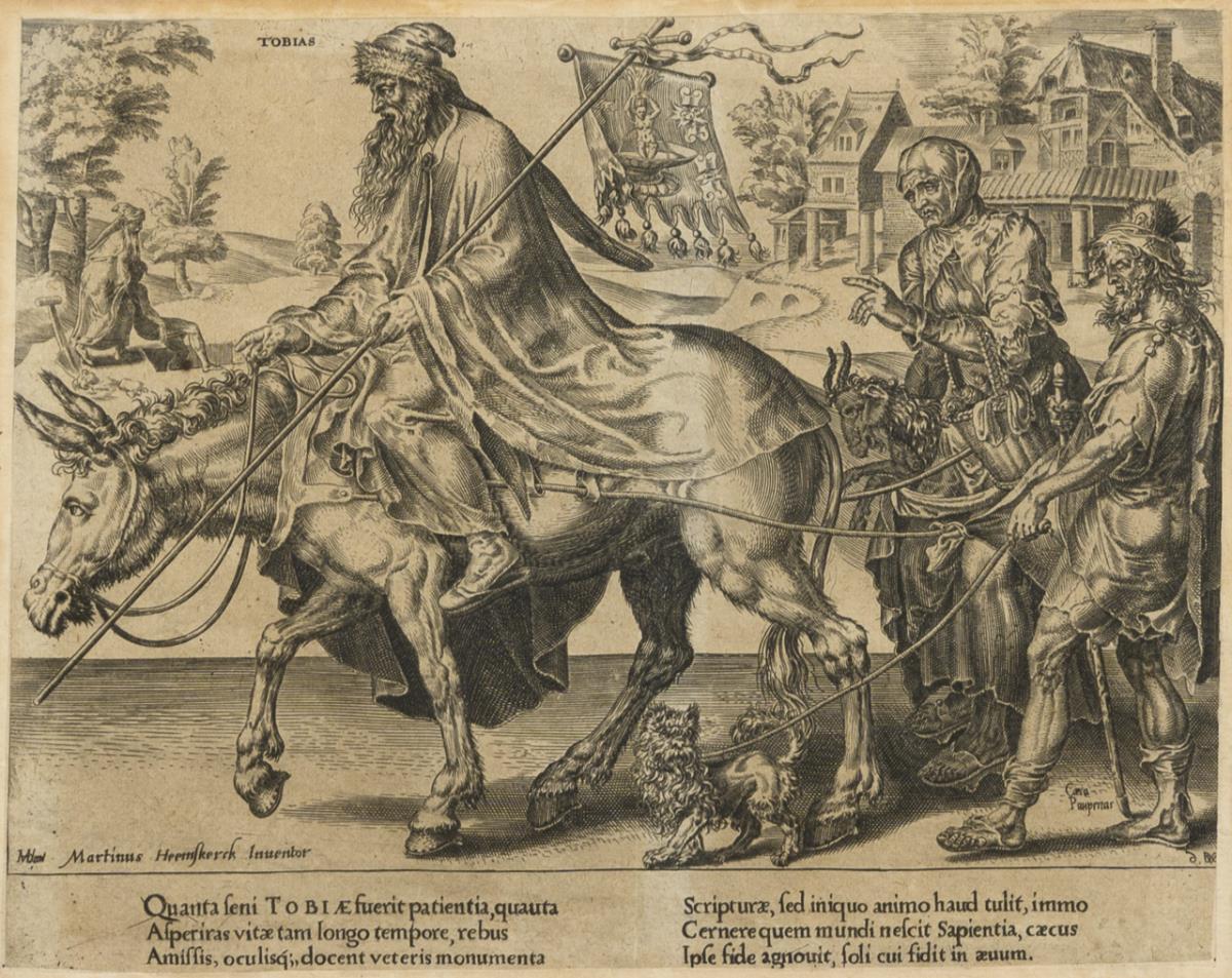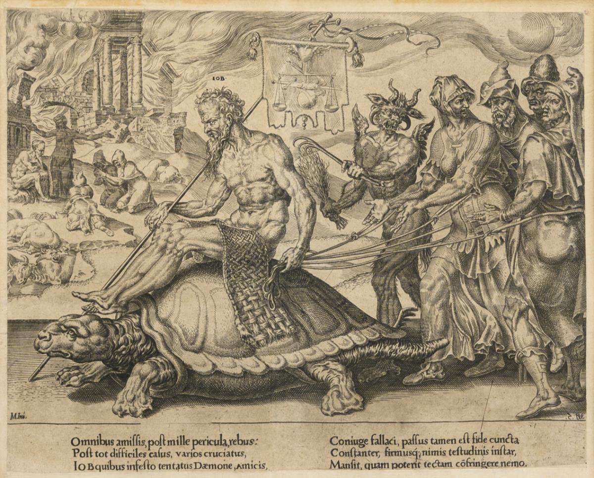 3 allegorische Darstellungen: "Der Triumph des Tobias" | "Der Triumph des Hiob" | "Der Triumph des David" mit Begleittext in lateinischer Sprache; aus der Serie "Patientiae Triumphus Elegantisssimis Imaginibus Expressus" nach Gemälden von Maerten van Heemskerck (1498 - 1574), 1559 (veröffentlicht 1638). Blatt je restauriert, je mit Bräunungsspuren.