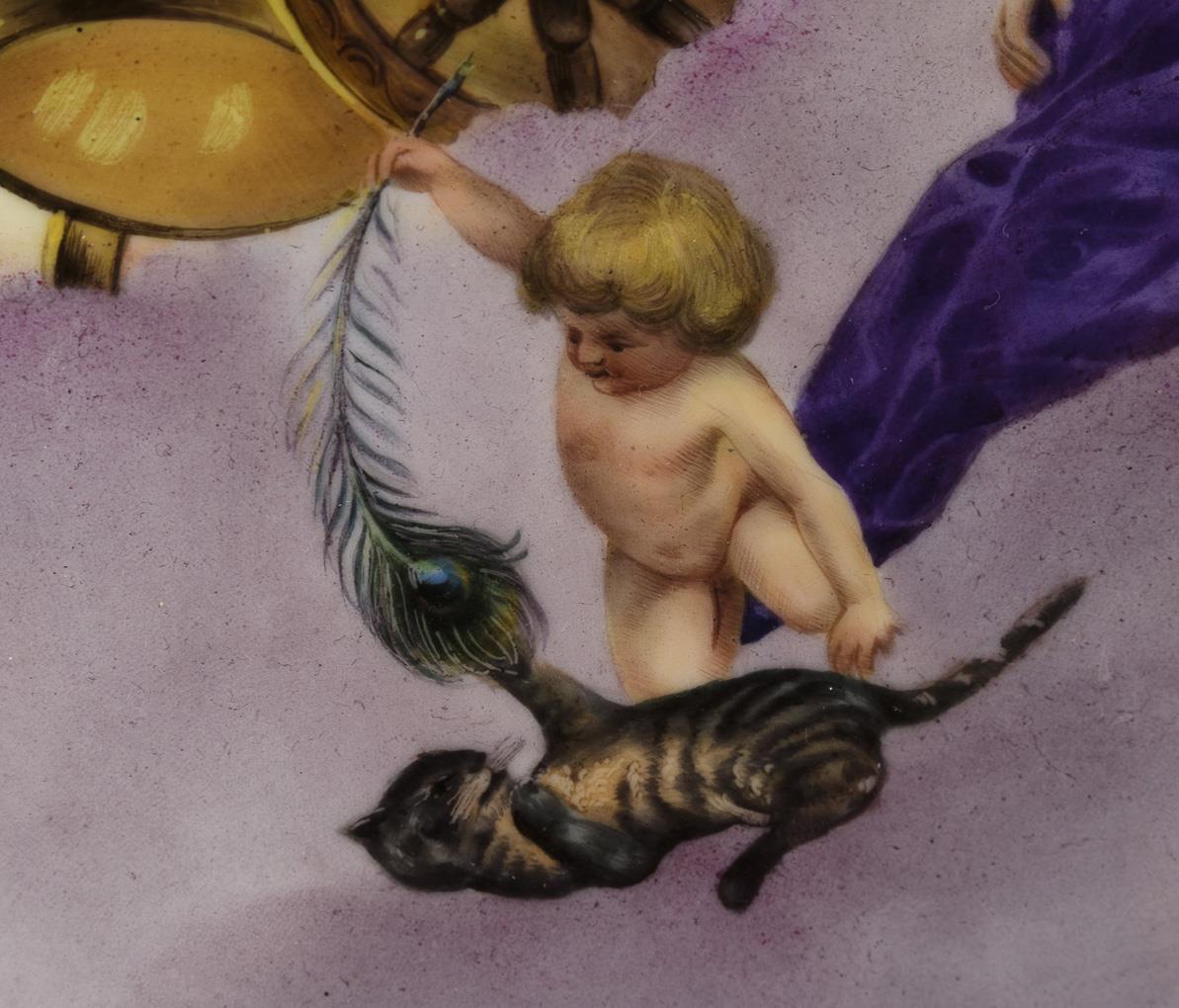 Gemuldeter Teller mit der Darstellung der Hera (?) in einem von Schwänen gezogenen Streitwagen, umgeben von einem jungen Pärchen, einem Putto sowie einem mit einer Katze spielenden Kind.