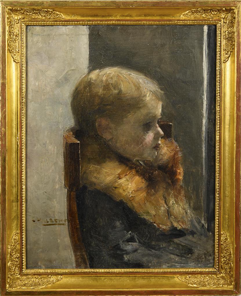 Auf einem Stuhl sitzendes Kind mit pelzverbrämtem Mantel im hellen Licht.
