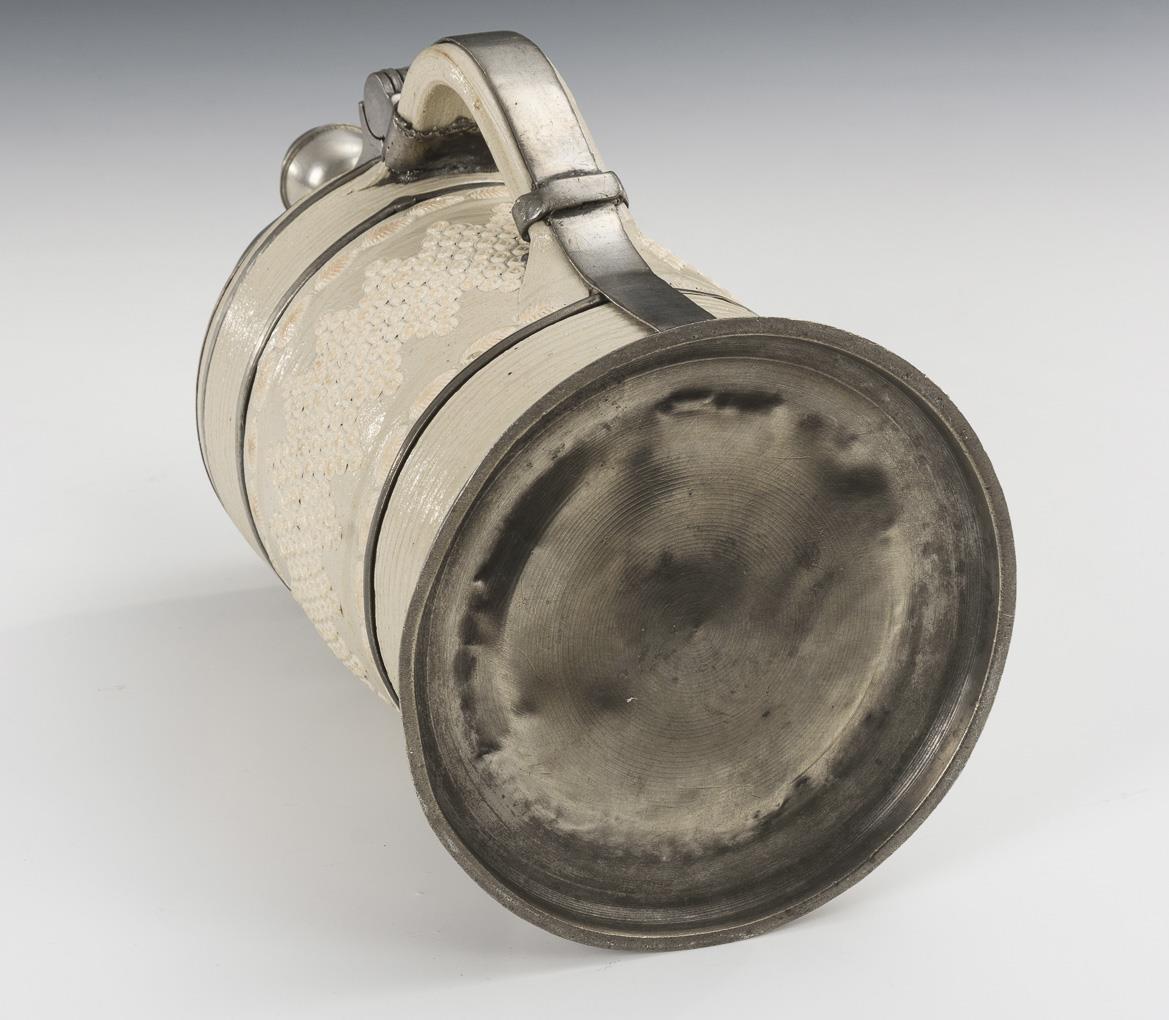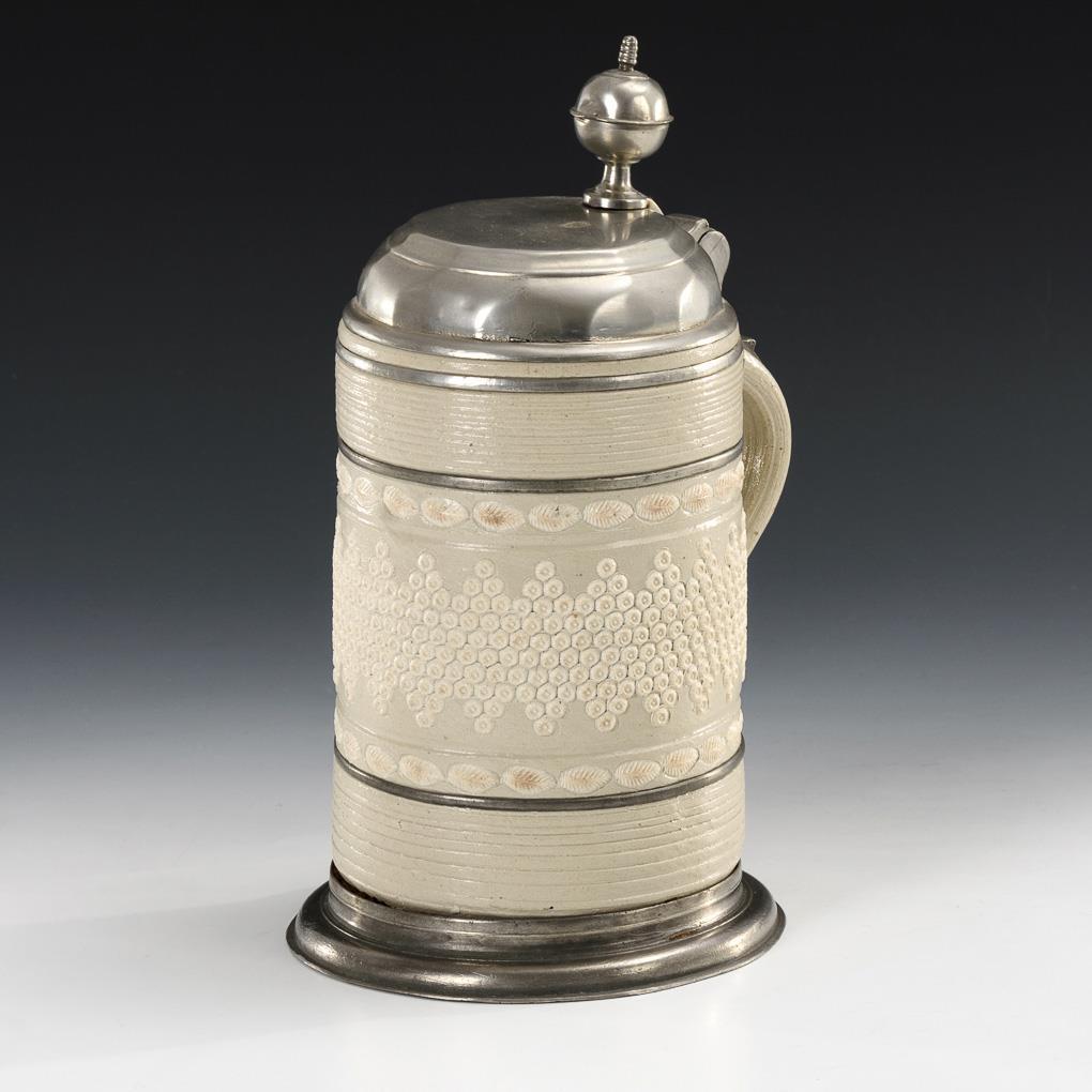 Walzenkrug mit Bandhenkel. Querrillen- und Stempeldekor mit umlaufendem Rosettenfries und Blattbändern. Zinnmontierung mit gepunztem Deckel, Kugeldrücker, Wandungsringen und Henkelband sowie Zinnstand. Leichte Bestoßung an Lippe, Zinn mit Gebrauchsspuren, kleinen Defekten und Reparaturen.