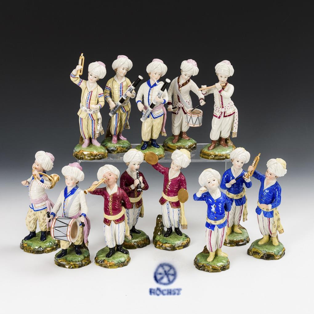 13 orientalisch gekleidete Kinder mit Turban, verschiedene Instrumente spielend. 5 Figuren mit Defekten: Bestoßungen an den Becken, 1 Instrument fehlt, 1x Mundstück des Fagotts fehlt, 1 Trommelstock bestoßen, 1 Kopf geklebt.