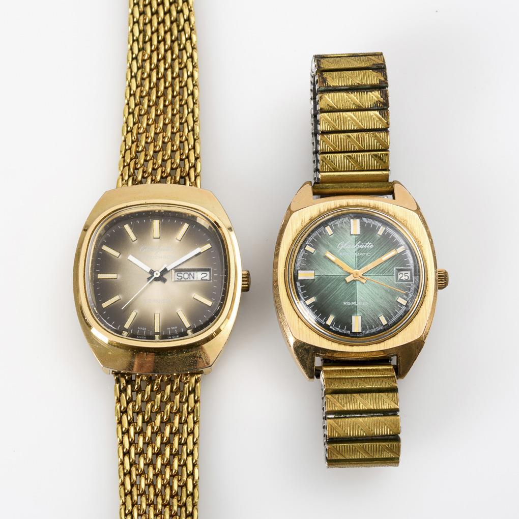 2 vergoldete Herrenarmbanduhren "Spezimatic" und "Spezichron". GUB Glashütte.
